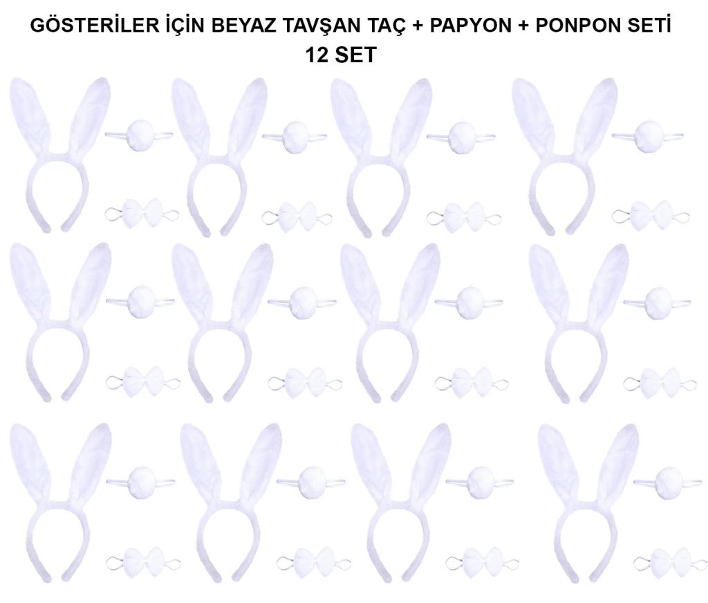 12 Adet Beyaz Tavşan Kostüm Seti (Her Set: 1 Adet Taç, 1 Adet Papyon, 1 Adet Kuyruk)