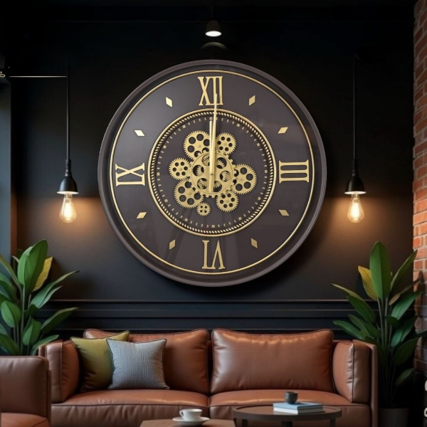 55 cm çapındaki çarklı duvar saati, büyük boy ölçüsü ve iç kısmında yer alan detaylı mekanik çark tasarımıyla bulunduğu ortamda güçlü ve dikkat çekici bir dekoratif etki oluşturur. Görselde de net şekilde görülen açık mekanizmalı çark detayı, saate endüstriyel ve vintage tarzı bir karakter kazandırırken, Roma rakamlı kadran yapısı klasik estetik anlayışı modern çizgilerle birleştirir. Altın tonlu çark ve rakam detayları, koyu zeminle kontrast oluşturarak saatin uzaktan bile rahatça okunmasını sağlar. Geniş kadranı sayesinde salon, oturma odası, ofis, kafe, restoran ve loft tarzı mekânlarda dekorasyonun odak noktası haline gelir. Dengeli çalışan saat mekanizması sessiz bir kullanım sunarak yaşam alanlarında konfor sağlar. Sağlam gövde yapısı ve kaliteli malzeme hissi uzun ömürlü kullanım avantajı sunarken, duvara kolayca asılabilen tasarımı ile pratik kurulum imkânı sağlar. Dekorasyonda sıradan saatlerden farklı, prestijli ve karakter sahibi bir ürün arayan kullanıcılar için hem fonksiyonel hem de estetik açıdan güçlü bir tercihtir.