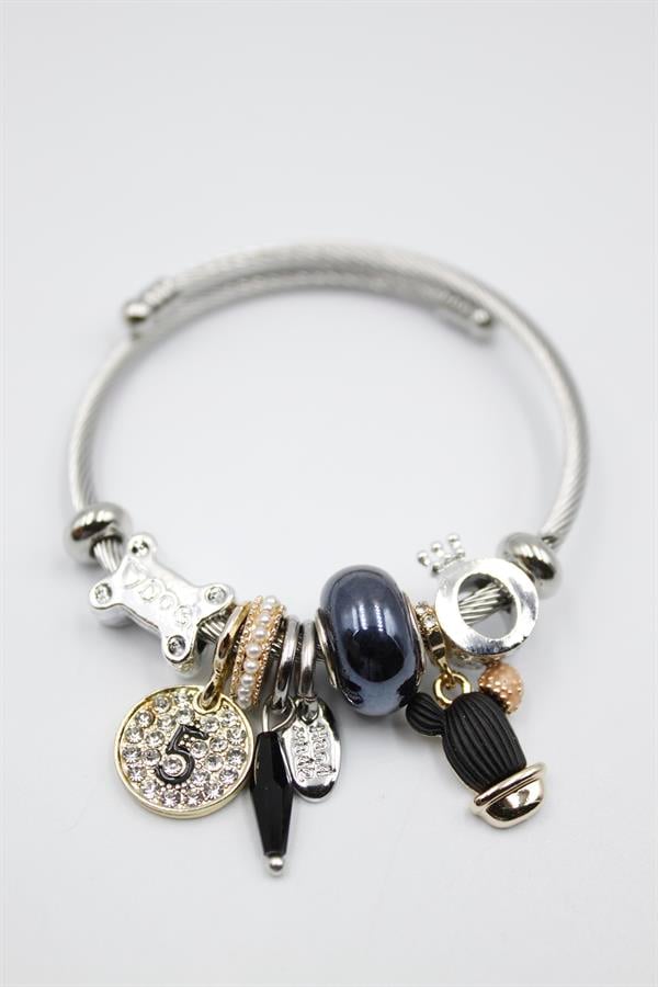 Çelik Charmlı Kaktüs Bilezik - Siyah
