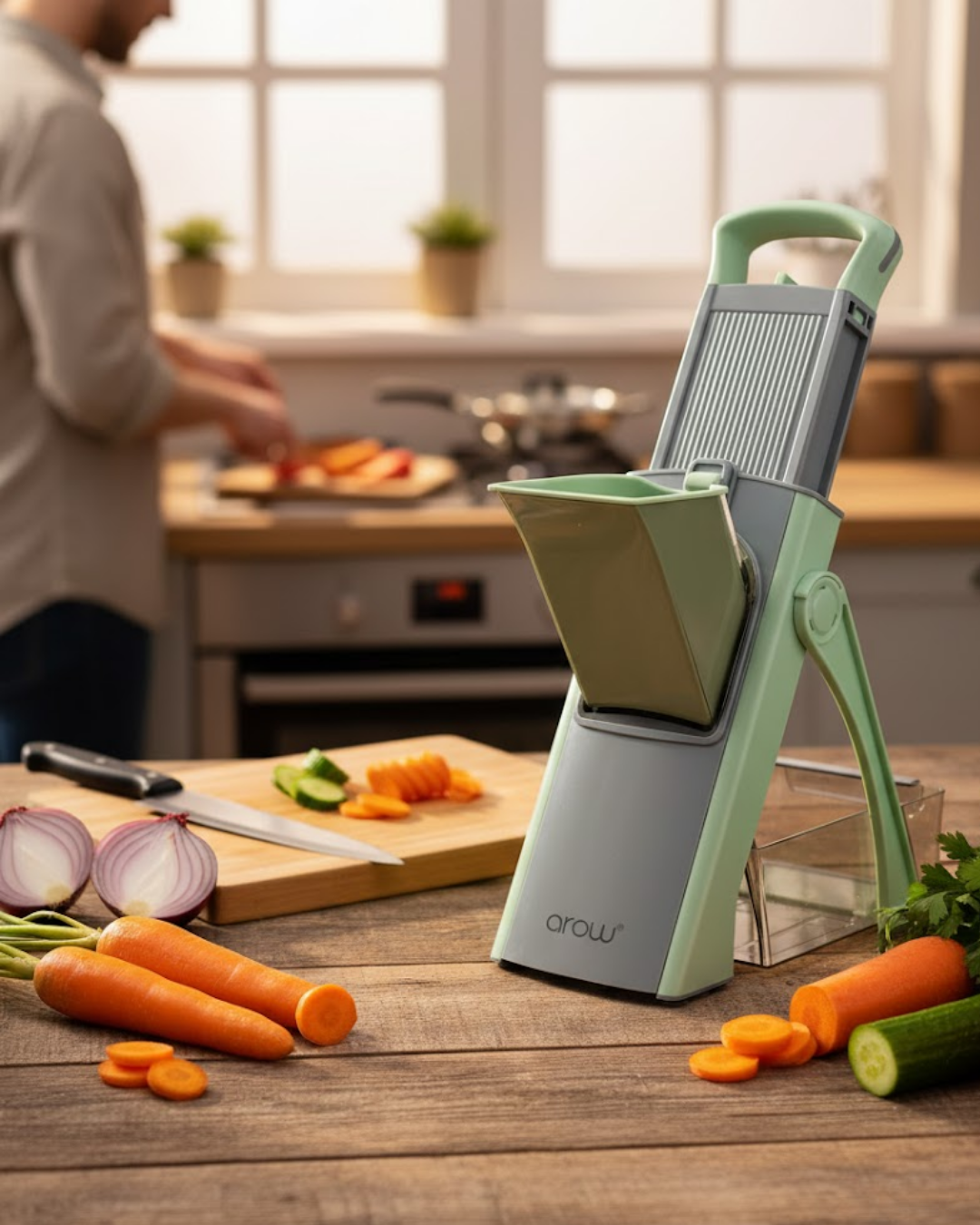 Üstte yer alan bastırma aparatı, kullanıcıya kontrollü ve dengeli bir doğrama deneyimi sunar. Bu yapı sayesinde eliniz doğrudan bıçaklarla temas etmez ve güvenli kullanım ön planda tutulur. Ergonomik tasarım, hem sağ hem sol el kullanımına uygundur.