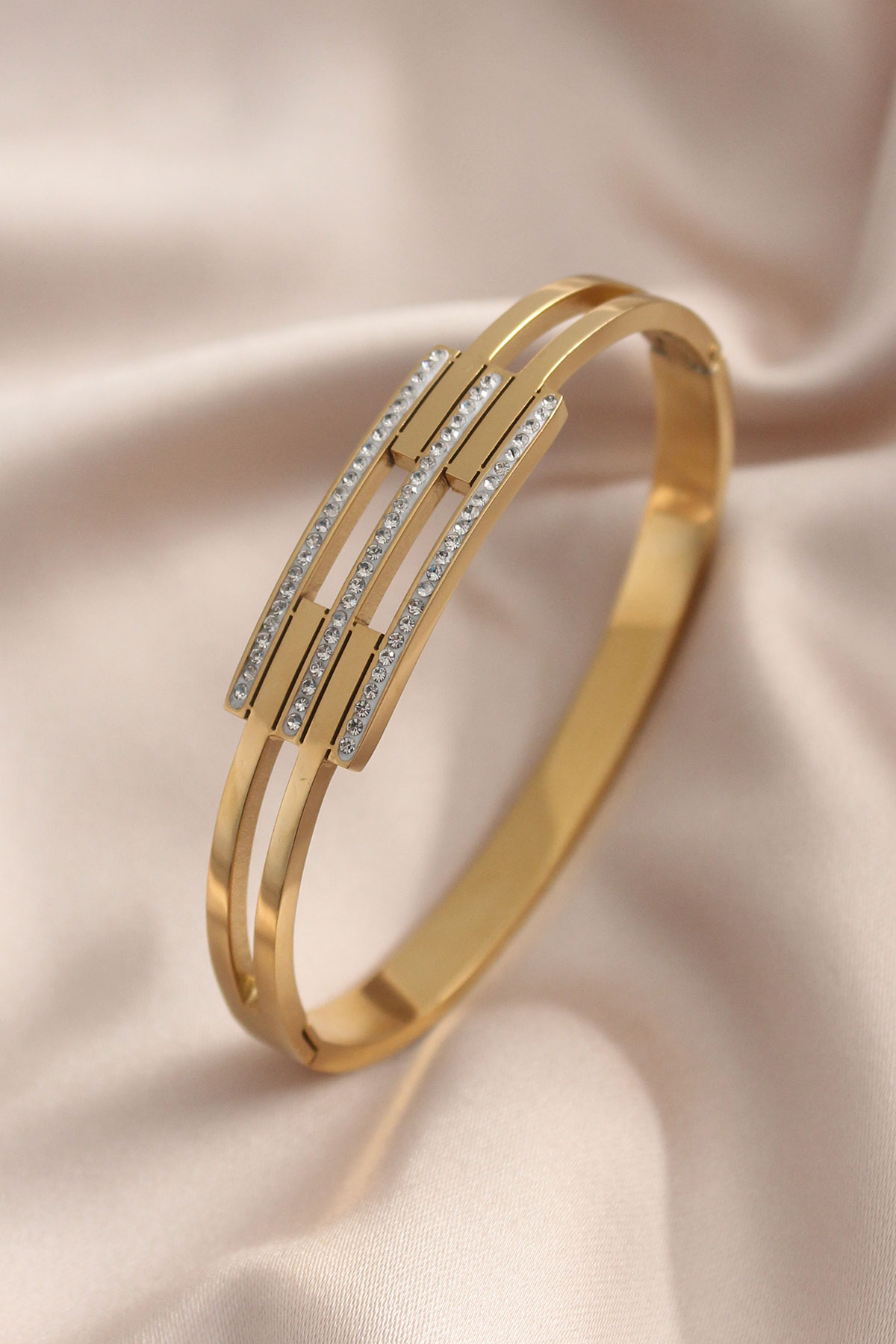 Çelik Gold Renk Taşlı Kaburga Model Kelepçe Kadın Bileklik - TJ-BB4665