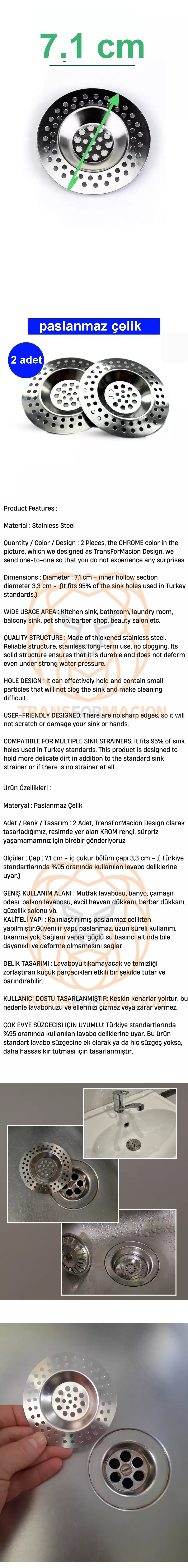 Ölçüler : Çap : 7,1 cm - iç çukur bölüm çapı 3,3 cm - ,( Türkiye standartlarında %95 oranında kullanılan lavabo deliklerine uyar.)