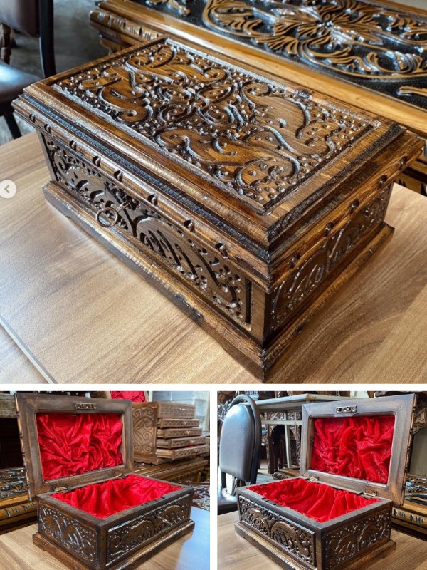 Ceviz Ahşap oymalı kilitli hediyelik dekoratif mücevher & özel eşya kutusu. Ürün içi kadifedir. Ürün ölçüleri (dıştan): 24 x 14.5 x 12 cm Ürün ölçüleri (içten) : 18.5 x 10 x 6 cm
