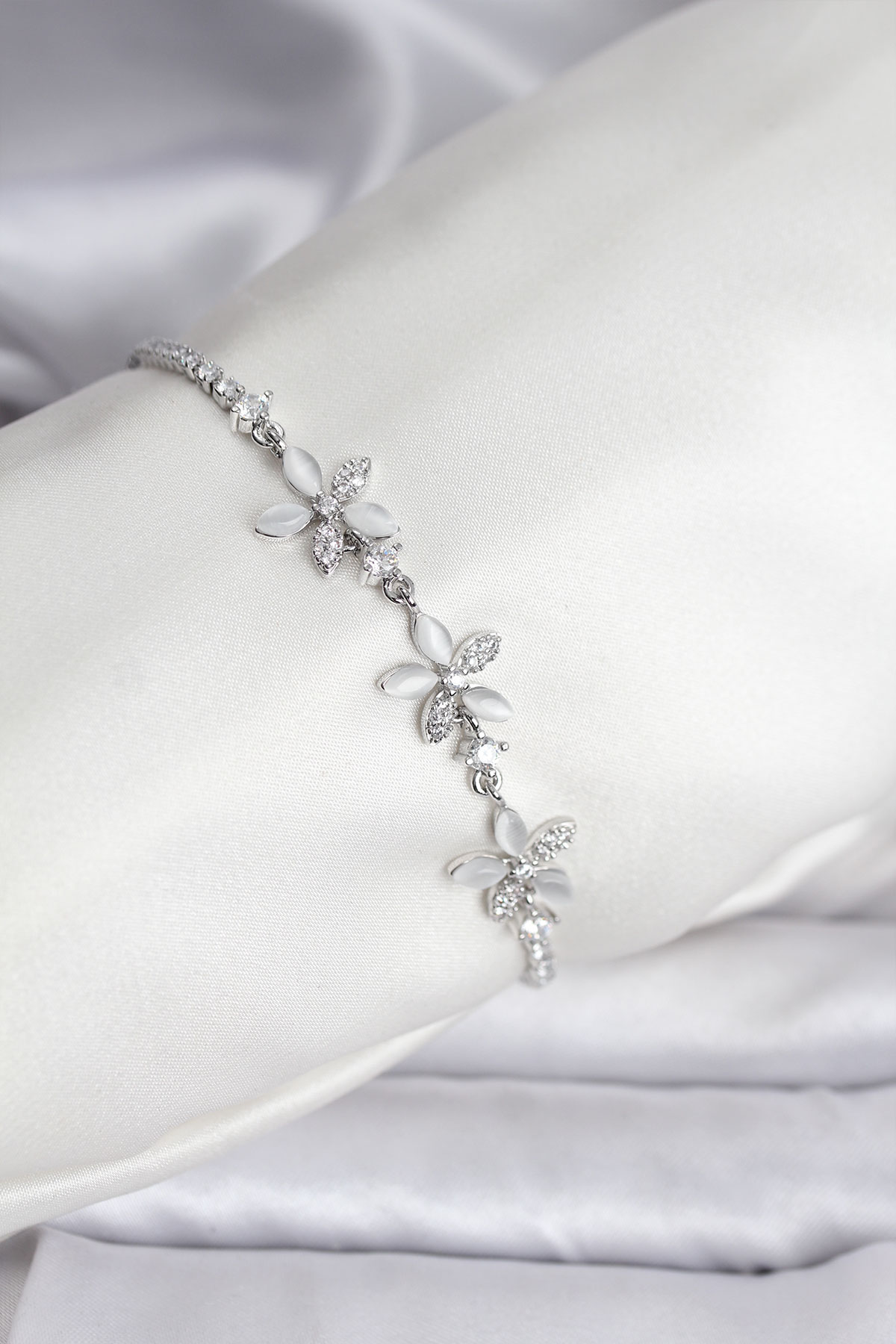Çiçek Model Zirkon Taşlı Gümüş Renk Pirinç Su Yolu Kadın Bileklik - TJ-BB8113
