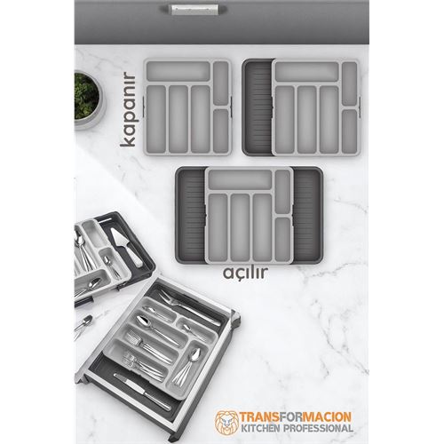 Nasıl Kullanılır? Organizasyon aparatını, ihtiyacınıza göre 31 cm, 42 cm ya da 53 cm genişliğe göre ayarlayın. Kesme takımlarınızı, her biri için ayrılmış bölmelere yerleştirin. Modern tasarımı sayesinde, eşyalarınız her zaman düzenli ve şık bir görünüm kazanır.