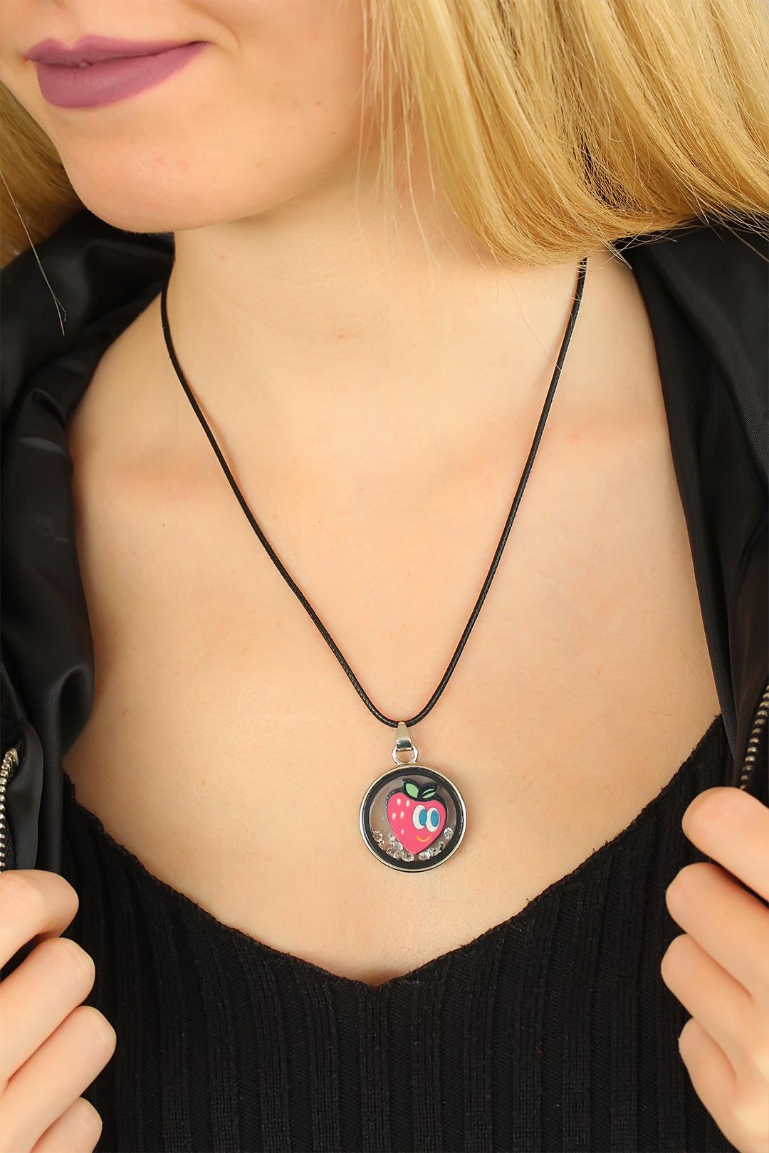 Çilek Figürlü Siyah Deri İpli Bayan Kolye - TJ-BKO4490-KS