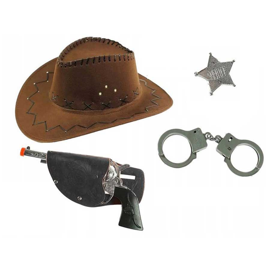 Çocuk Boy Kahverengi Kovboy Şapka Tabanca Rozet ve Kelepçe Seti 4 Parça