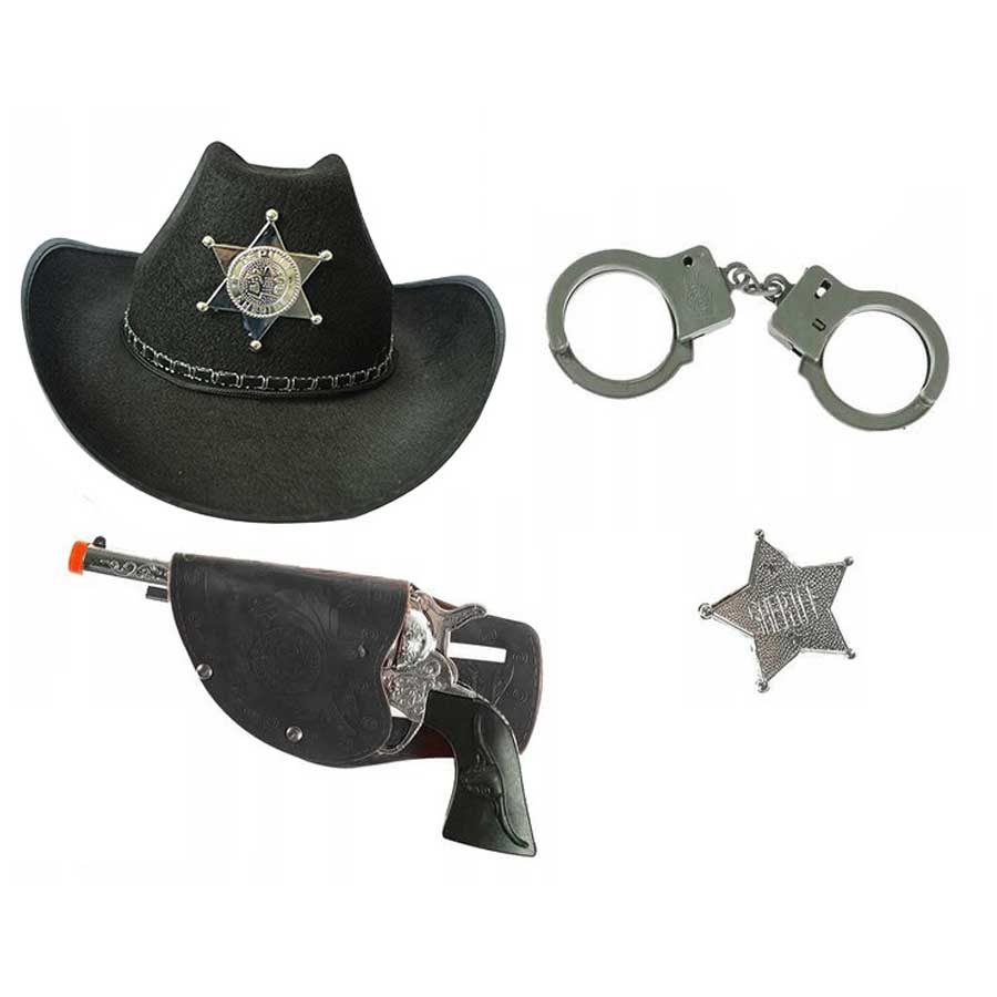 Çocuk Boy Siyah Şerif - Kovboy Şapka Tabanca Rozet ve Kelepçe Seti 4 Parça