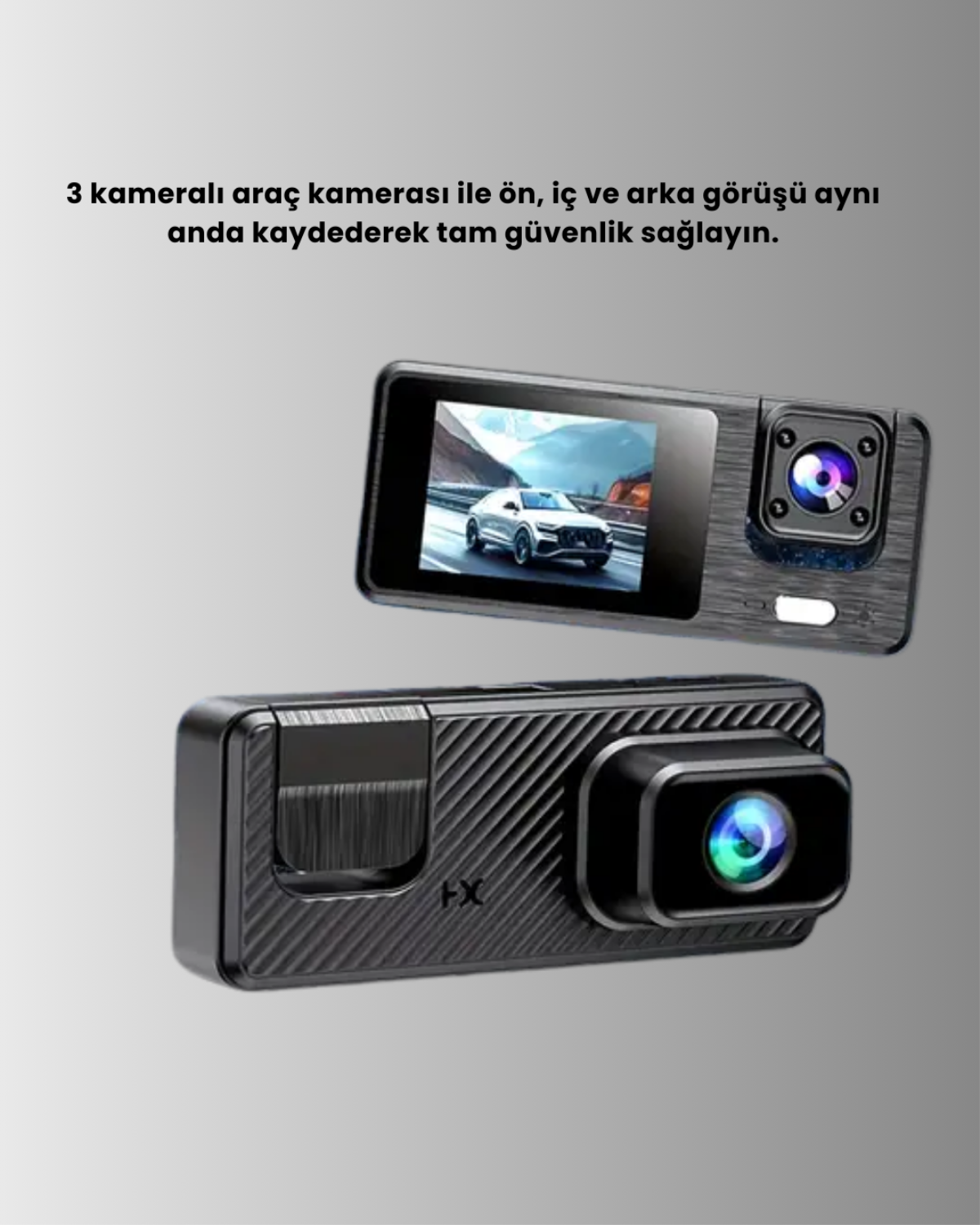 Bu araç kamerası, üçlü lens yapısıyla öne çıkar. Ön, iç ve arka kameraları sayesinde tüm açılardan kayıt yaparak sürüş güvenliğini artırır. 1080P çözünürlükle kayıt alırken, AVI formatında döngü video teknolojisiyle sürekli kullanım sağlar. Bellek dolduğunda eski görüntüler otomatik silinir. Zaman senkronizasyon özelliği, her görüntüyü tarih ve saat bilgisiyle kaydeder. Stereo ses kaydı, ortam seslerini de arşivler. Araçla birlikte otomatik açılıp kapanma özelliği kullanım kolaylığı sunar. Geri görüş kamerası, geri vitese geçildiğinde otomatik devreye girer. 2 inç ekran, görüntüleri net şekilde izleme imkanı tanır. Ayrıca park modu desteği ile aracınız 7/24 korunur.