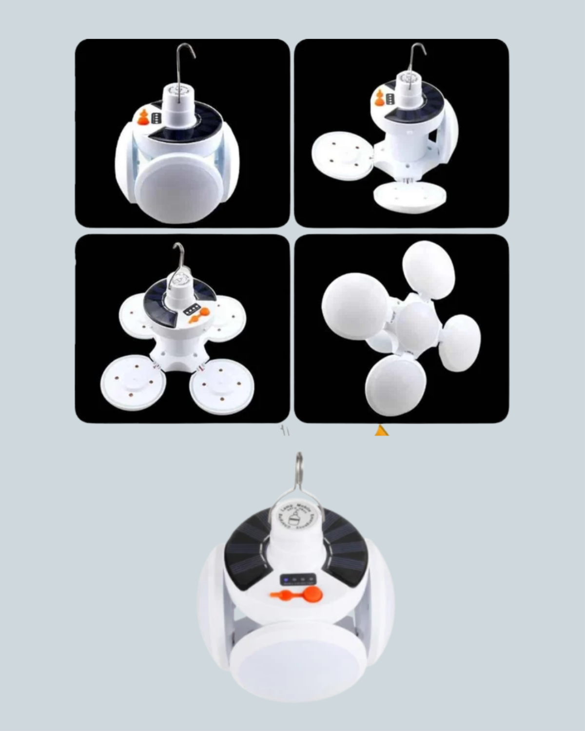 Bu çok amaçlı LED lamba, hem masa üstünde hem de yukarıdan asılarak kullanılabilir. Katlanabilir LED panelleri farklı yönlere çevrilerek ortamın ihtiyacına göre özelleştirilmiş aydınlatma sağlar. Solar panel ile güneşten şarj olabilir, aynı zamanda USB bağlantısıyla şehir elektriğinden de şarj edilebilir.