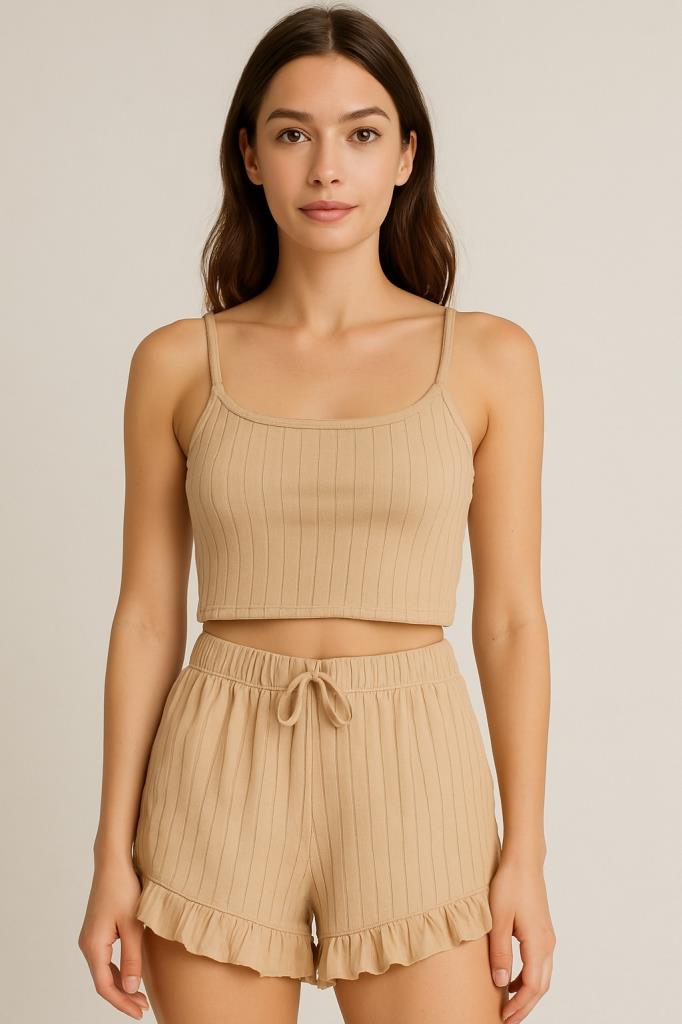Crop Takım - Askılı Crop Takım Likralı Bej (L)