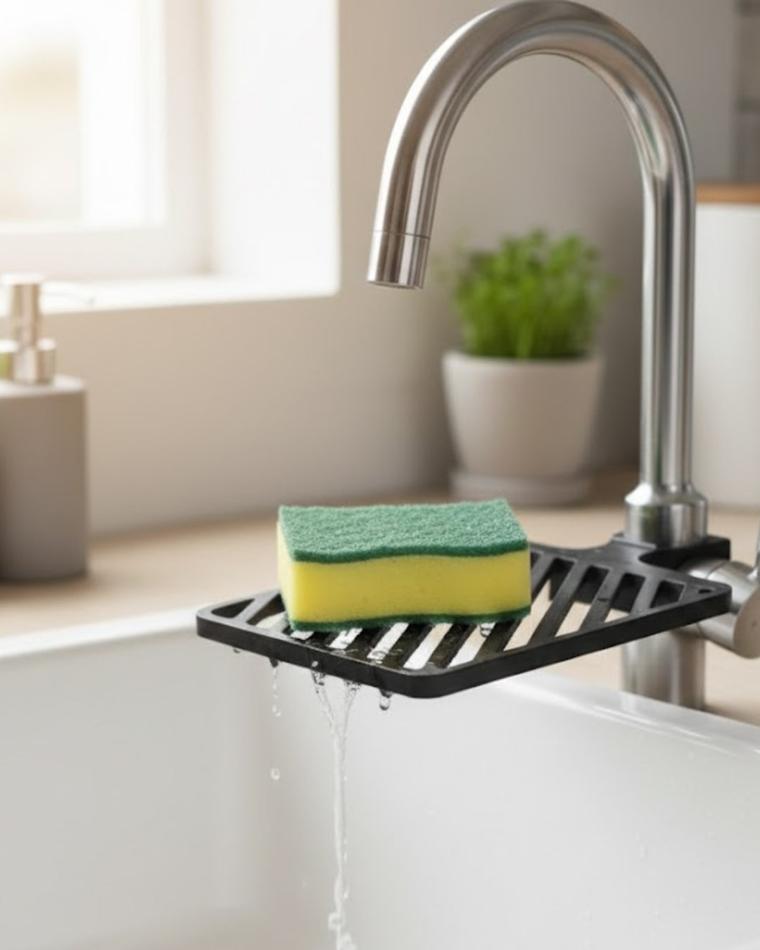 Damlama tepsili musluk sünger tutucu, mutfak süngerinin ıslak kalmasını önleyerek daha hijyenik bir kullanım sunar. Sünger, musluğa entegre edilen tepsi üzerinde durur ve yıkama sonrası akan su doğrudan evyeye yönlendirilir. Böylece tezgâh üzerinde su birikmez ve mutfak daha temiz kalır. Kompakt yapısı sayesinde az yer kaplar ve mutfak düzenini bozmaz. Süngerin sürekli ıslak yüzeyle temas etmesini engelleyerek daha uzun süre temiz kalmasına yardımcı olur. Günlük mutfak kullanımını kolaylaştıran, pratik ve düzen sağlayan fonksiyonel bir mutfak aksesuarıdır.