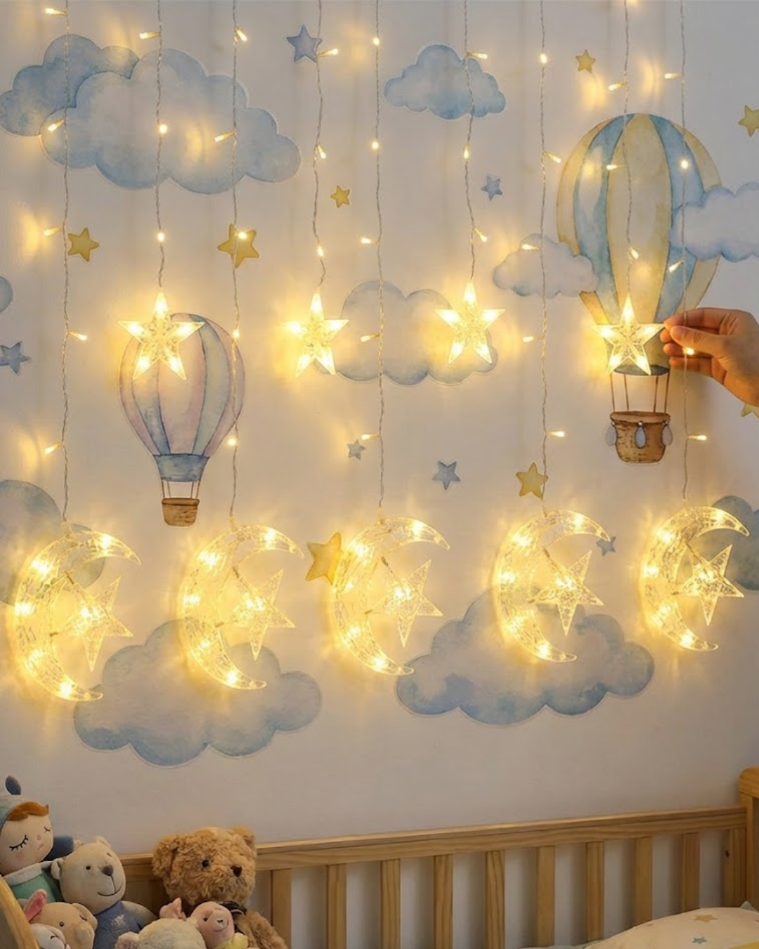 Hilal ve yıldız figürlü bu ışık zinciri, zarif detayları ve ince işçiliğiyle dikkat çeker. Figürlerin tasarımı sade ama etkileyici bir görünüme sahiptir. Mekâna yerleştirildiğinde dekorun merkez noktası haline gelir.