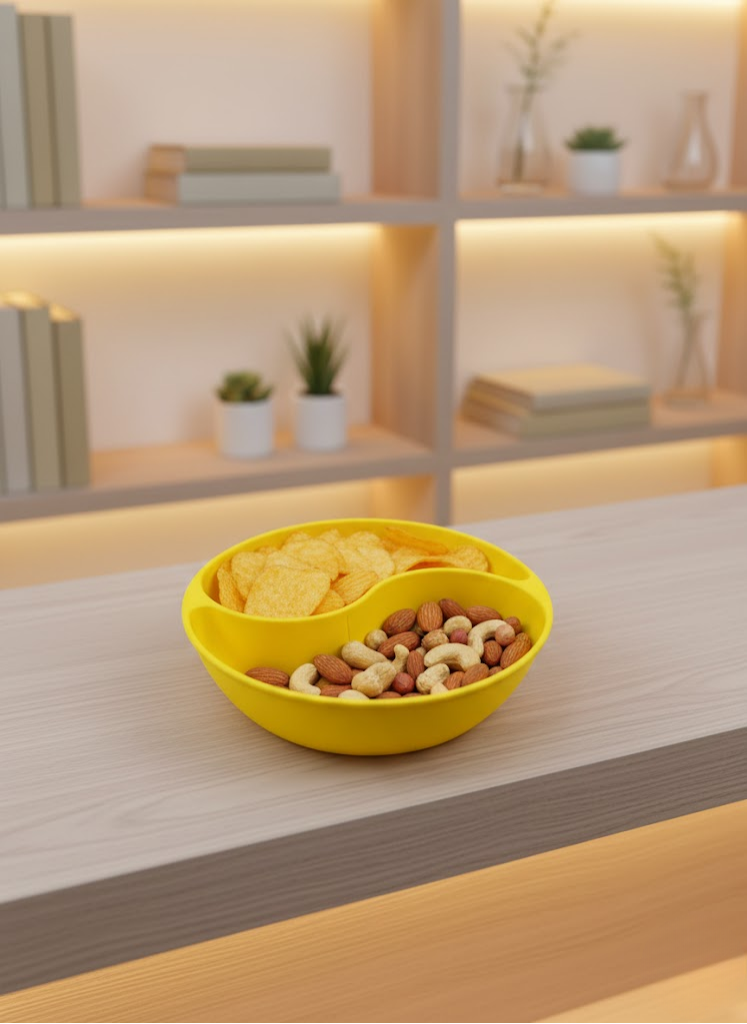 Bölmeli tasarımı, sunum sırasında düzenli bir görünüm oluşturur. Kuruyemiş, kraker veya küçük atıştırmalıklar ayrı bölmelerde sunularak estetik bir masa düzeni elde edilir. Sarı rengi, özellikle loş ama aydınlık salon ortamlarında dikkat çekici bir kontrast oluşturur.
