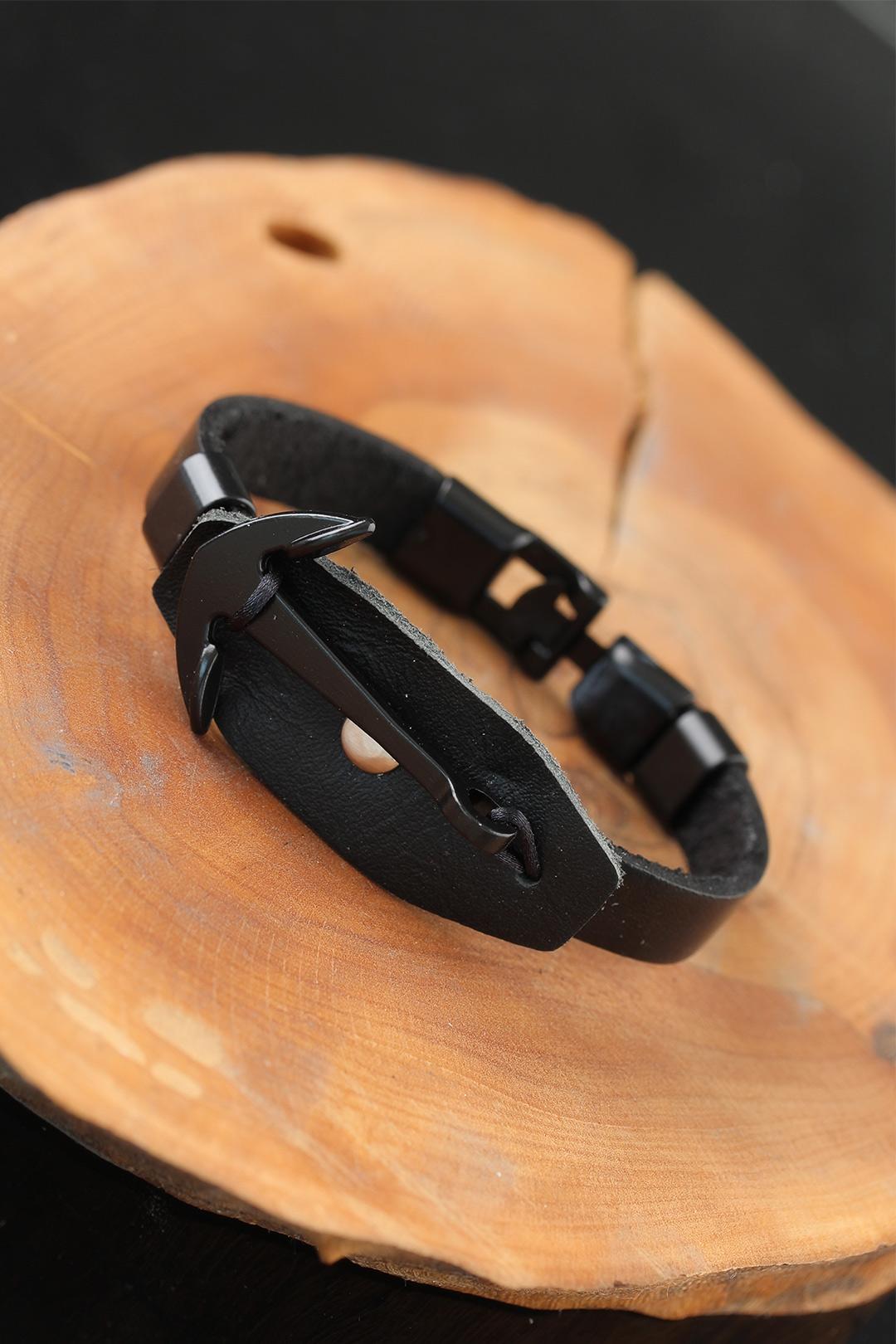 Deniz Çapalı Metal Aksesuarlı Siyah Deri Erkek Bileklik - TJ-EB2526-KS