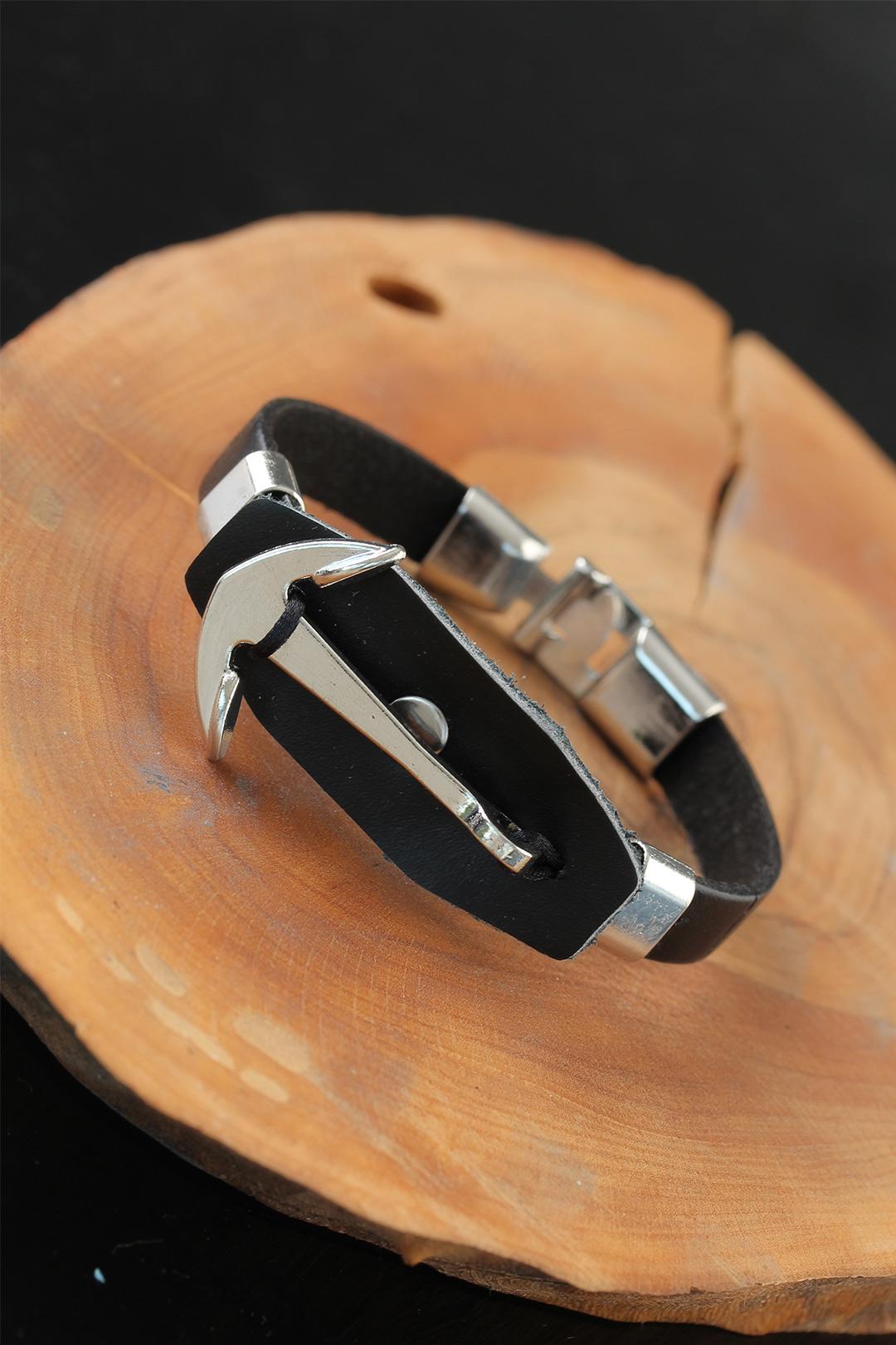 Deniz Çapalı Metal Aksesuarlı Siyah Renk Deri Erkek Bileklik - TJ-EB2535-KS