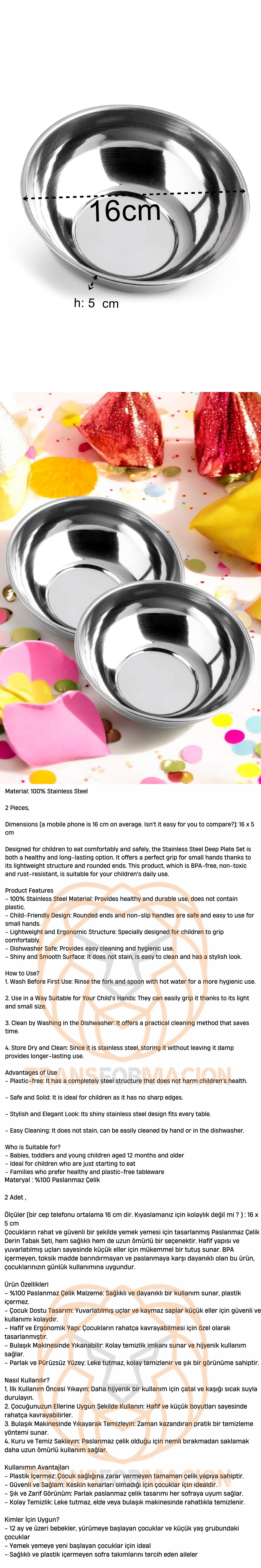 Çocukların rahat ve güvenli bir şekilde yemek yemesi için tasarlanmış Paslanmaz Çelik Derin Tabak Seti, hem sağlıklı hem de uzun ömürlü bir seçenektir. Hafif yapısı ve yuvarlatılmış uçları sayesinde küçük eller için mükemmel bir tutuş sunar. BPA içermeyen, toksik madde barındırmayan ve paslanmaya karşı dayanıklı olan bu ürün, çocuklarınızın günlük kullanımına uygundur.