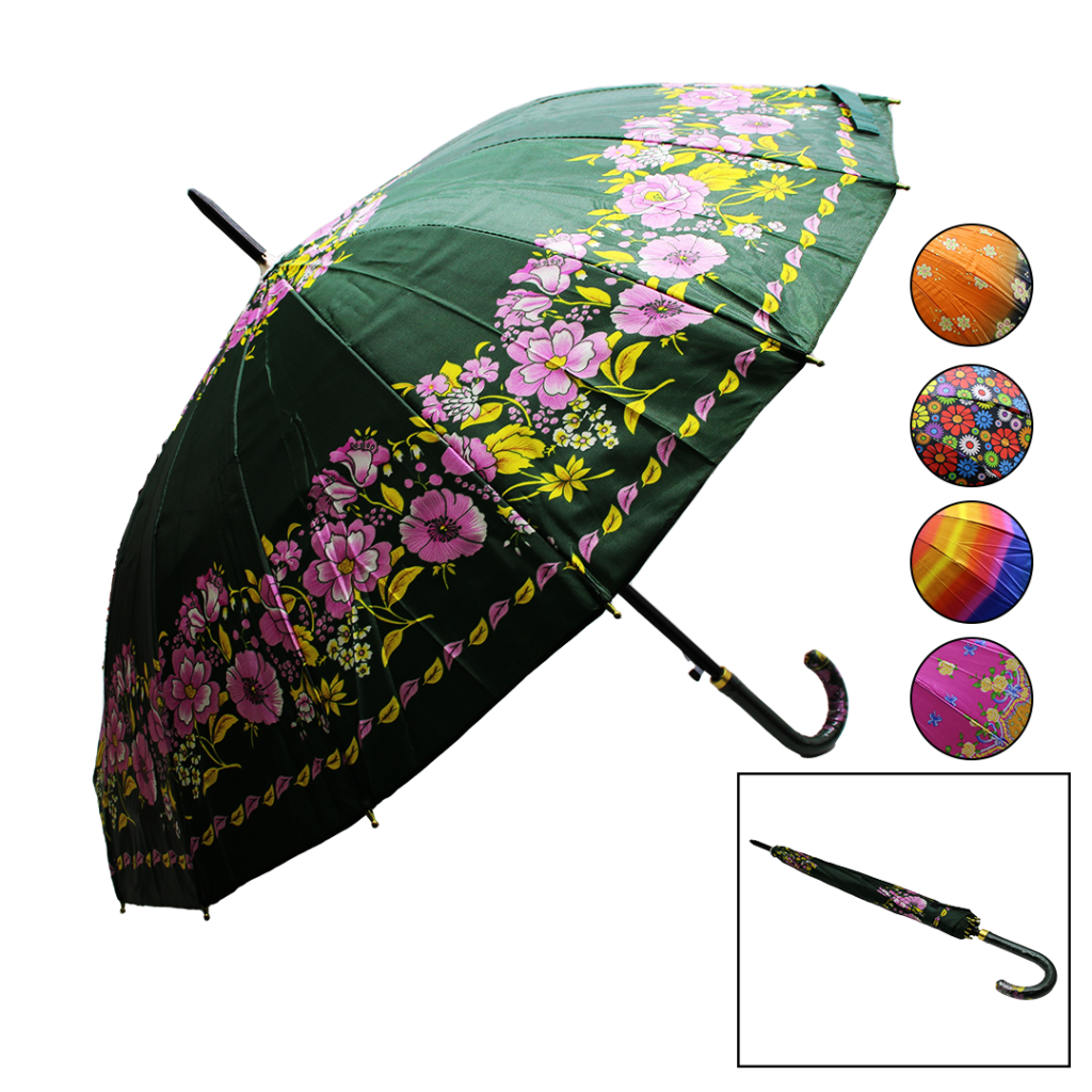 Desenli Renkli Saplı Bayan - 16 Telli Baston Şemsiye Renkli