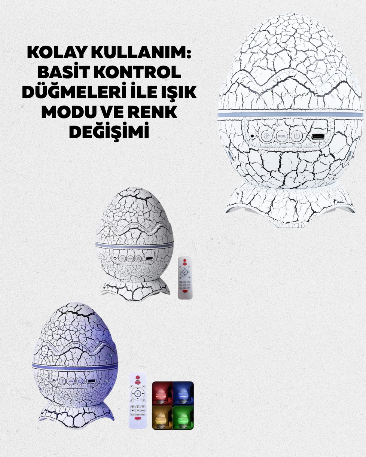 Çocuk odaları için özel olarak tasarlanan bu dinozor yumurtası projektör, 4 farklı özelliği tek bir cihazda sunar: Gece lambası, galaksi projektör, müzik hoparlörü ve beyaz gürültü makinesi. Çocukların korkmadan uyuması için sıcak ve yumuşak tonlarda ışıklar sunar. 14 renge kadar ayarlanabilen projektör ile yıldızlar ve galaksi görüntüsü odada sihirli bir atmosfer yaratır. Bluetooth bağlantı ile masal ya da ninni açabilir, seslerin ışıkla birlikte hareket etmesini sağlayabilirsiniz. 19 farklı doğa ve beyaz gürültü sesi, uykuya dalmayı kolaylaştırır. Ebeveynler için uzaktan kumanda sayesinde kontrol kolaylığı sağlar. Cihazı isterseniz 1-2 saate ayarlayarak otomatik kapanmasını sağlayabilir ya da 4 saat sonra kendiliğinden kapanmasına güvenebilirsiniz. Şık tasarımı sayesinde dekoratif amaçlı da kullanılabilir.