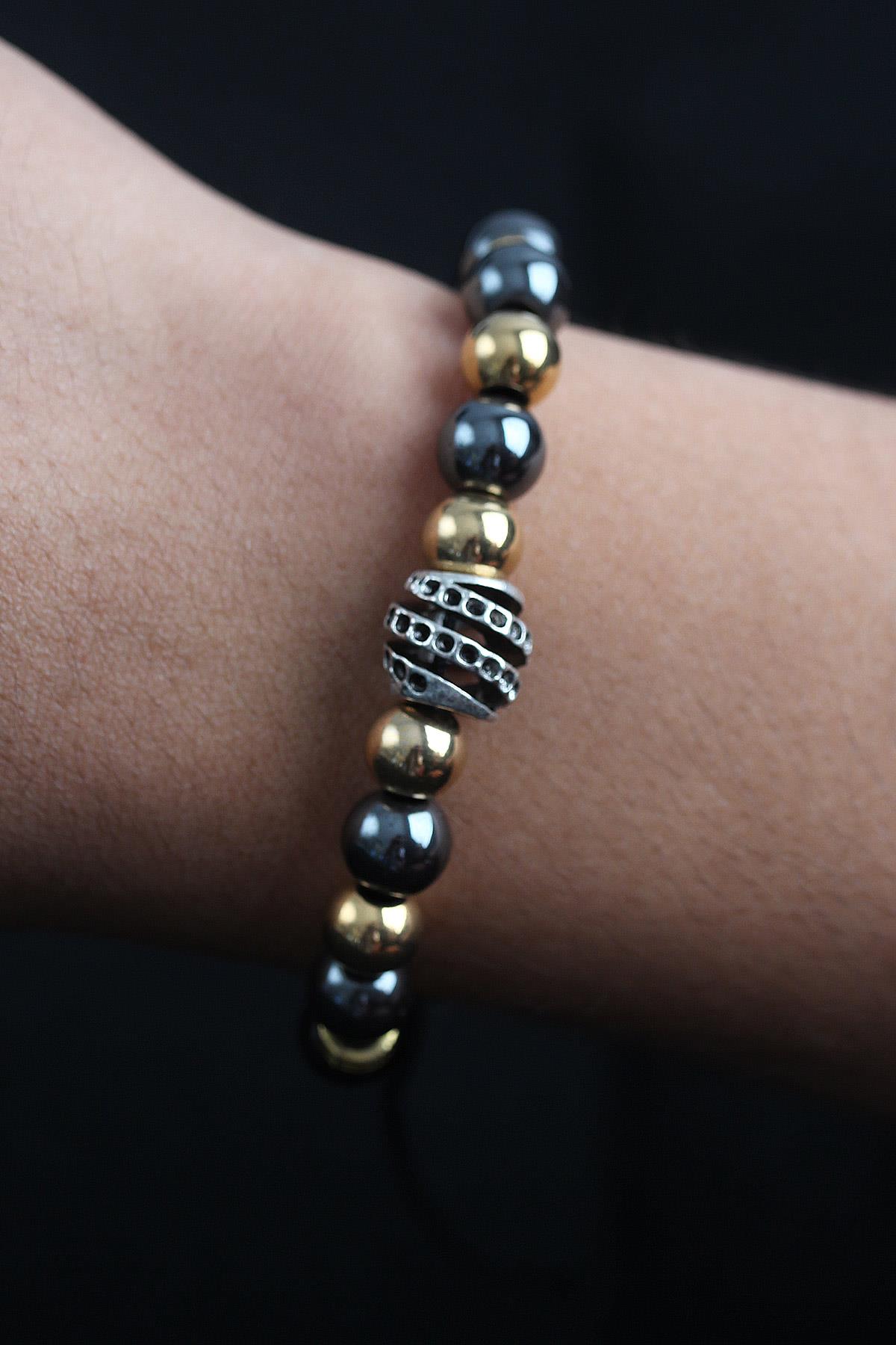 Doğal Taş Sarmal Model Gold Ve Füme Renk Asansörlü Erkek Bileklik - TJ-EB3756