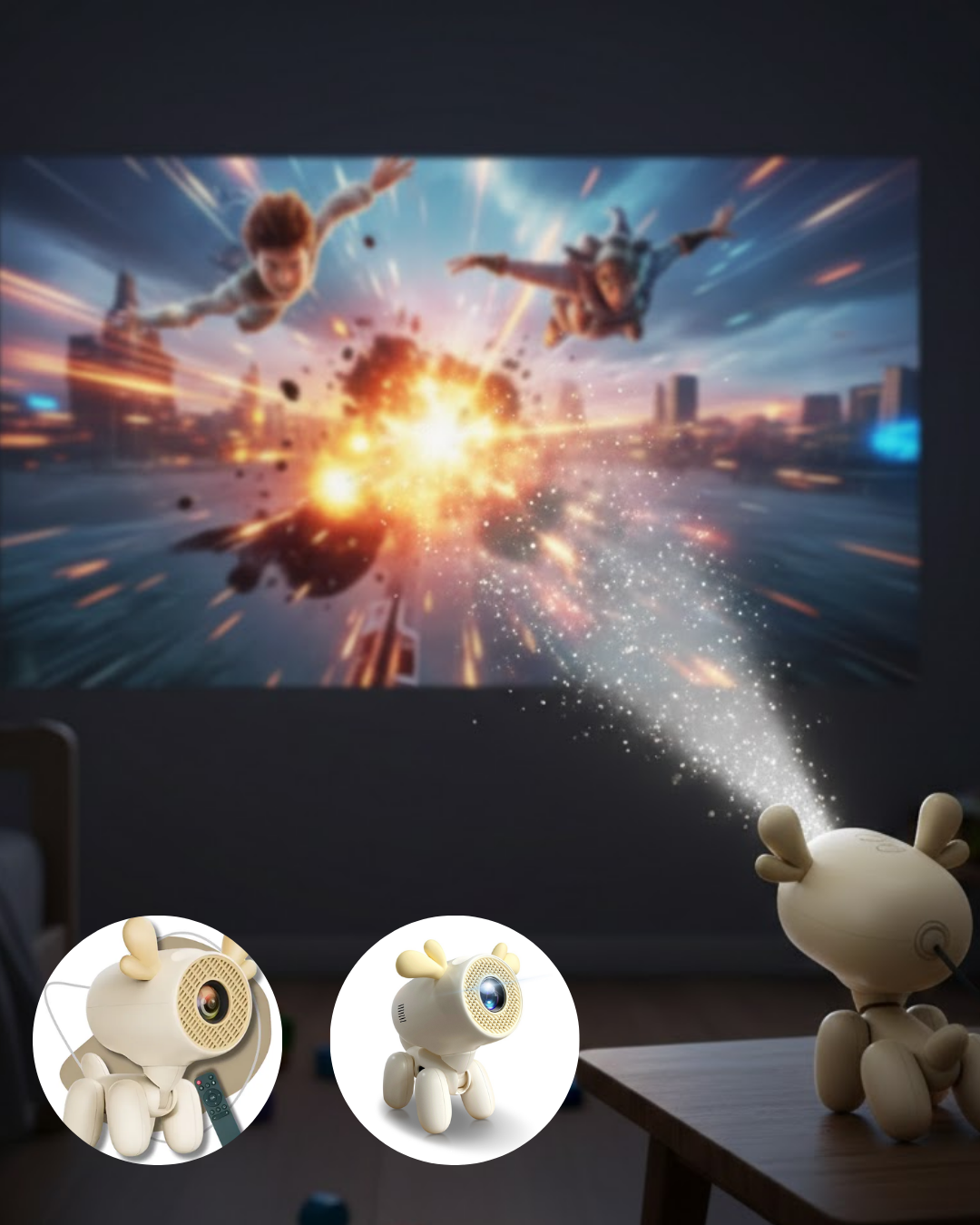 Döner başlıklı akıllı projeksiyon cihazı, yenilikçi tasarımı ve güçlü teknik altyapısı ile ev eğlence deneyimini ileri seviyeye taşır. Sevimli geyik formu sayesinde yalnızca bir projeksiyon cihazı değil, aynı zamanda dekoratif bir obje olarak da kullanılabilir. Kompakt gövde yapısı fazla yer kaplamaz ve entegre stand sistemi sayesinde ek aparat gerektirmeden dengeli şekilde konumlandırılabilir. 180° dönebilen başlık mekanizması, görüntüyü duvara, perdeye veya tavana yönlendirme özgürlüğü sunar. Bu özellik özellikle yatakta uzanarak tavana film izlemek isteyen kullanıcılar için büyük avantaj sağlar.