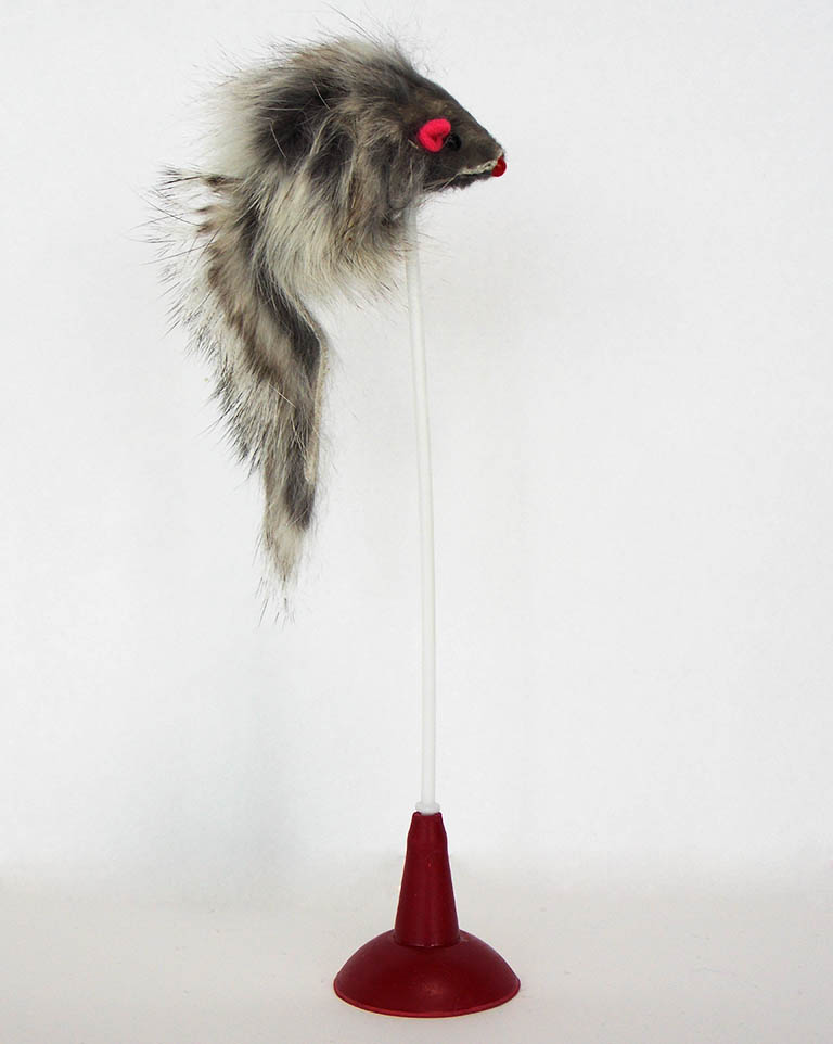 19 cm yüksekliğinde vantuz ayaklığı ile sert zemine tutturularak kullanılabilen uç kısmında peluş fare olan kedi oyuncağı.
