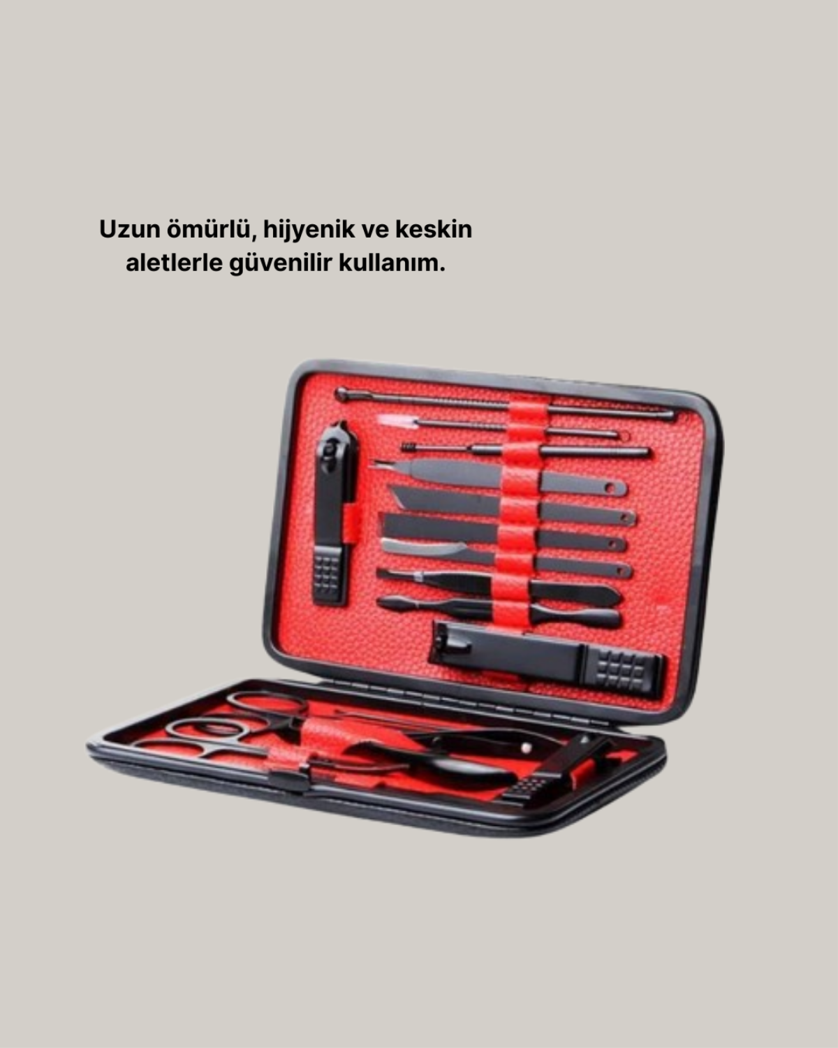 El ve ayak bakımını profesyonel düzeyde yapmak isteyenler için geliştirilen 17 parçalık manikür seti, tüm ihtiyaçlarınızı tek bir kutuda toplar. Paslanmaz çelikten üretilmiş parçaları, hijyenik ve dayanıklı yapısıyla uzun süre güvenle kullanılabilir. Keskin uçlu aparatlar sayesinde ölü deriler kolayca temizlenirken, ergonomik tasarımı kullanım kolaylığı sağlar. Setin içerisinde farklı boylarda tırnak makasları, törpü, cımbız, pedikür bıçakları ve kulak temizleme aparatı gibi birçok fonksiyonel parça bulunur. Modern siyah kutusu, kırmızı iç tasarımıyla şıklığı ön plana çıkarır ve tüm parçaların düzenli bir şekilde saklanmasını sağlar. Hafif ve taşınabilir yapısıyla bu set, seyahatlerde yanınızda kolayca götürülebilir. Ayrıca kutu üzerindeki tek tuşlu açma sistemi pratiklik kazandırır. Düzenli bakım yapmanıza yardımcı olan bu set, yalnızca kişisel kullanım için değil, aynı zamanda hediye alternatifi olarak da öne çıkar. Güzellik salonuna gitmeden profesyonel sonuçlar elde etmek isteyenler için mükemmel bir çözümdür.