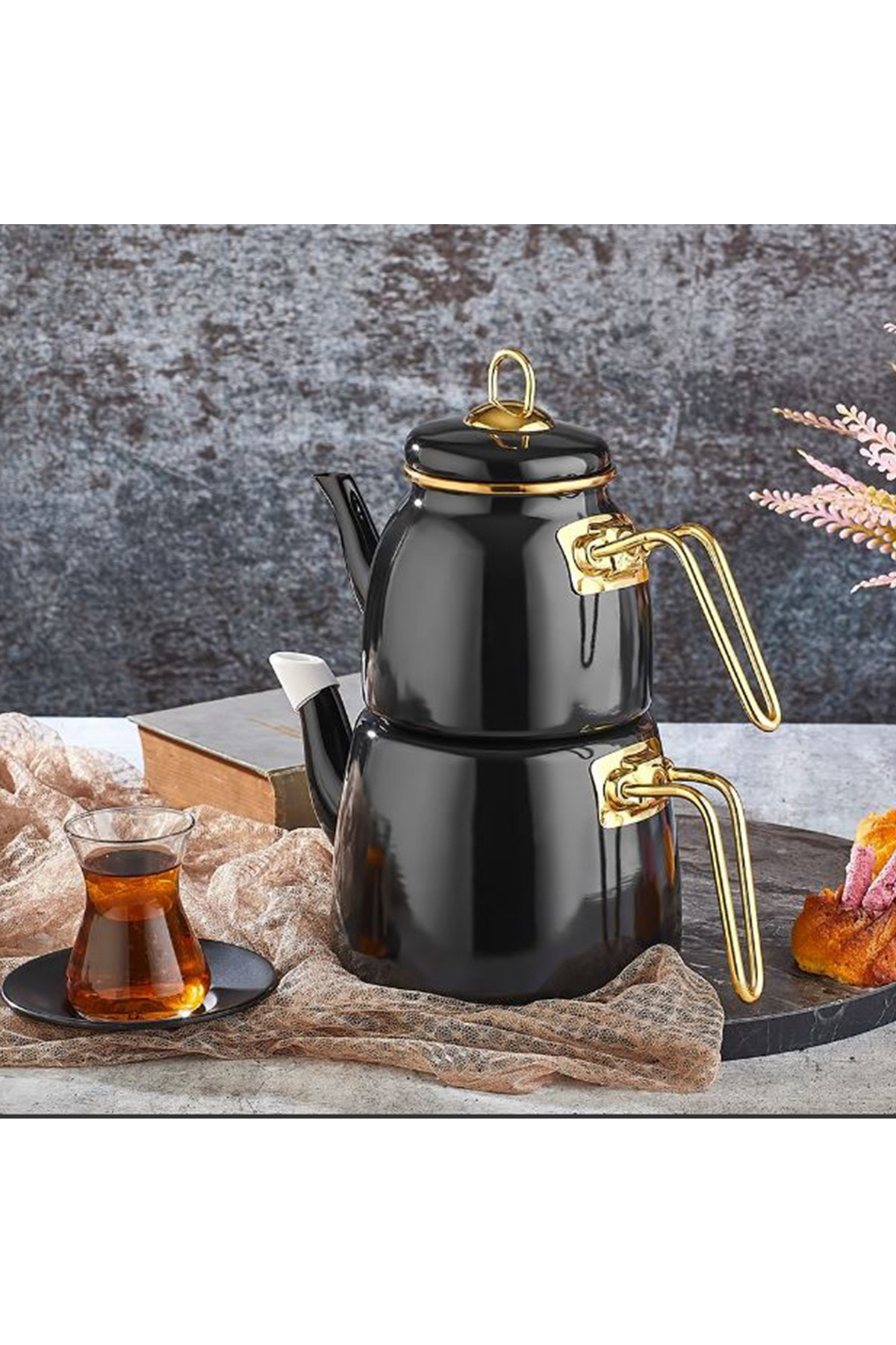 | Elite class emaye çaydanlıkhacim üst 1 lt alt 2 lt yüksek kalite emaye kapmalama gövdeçelik tutacaklar sizlere kolay kullanim sağlamla birlikte mutfaklariniza şiklik katacaktir |
