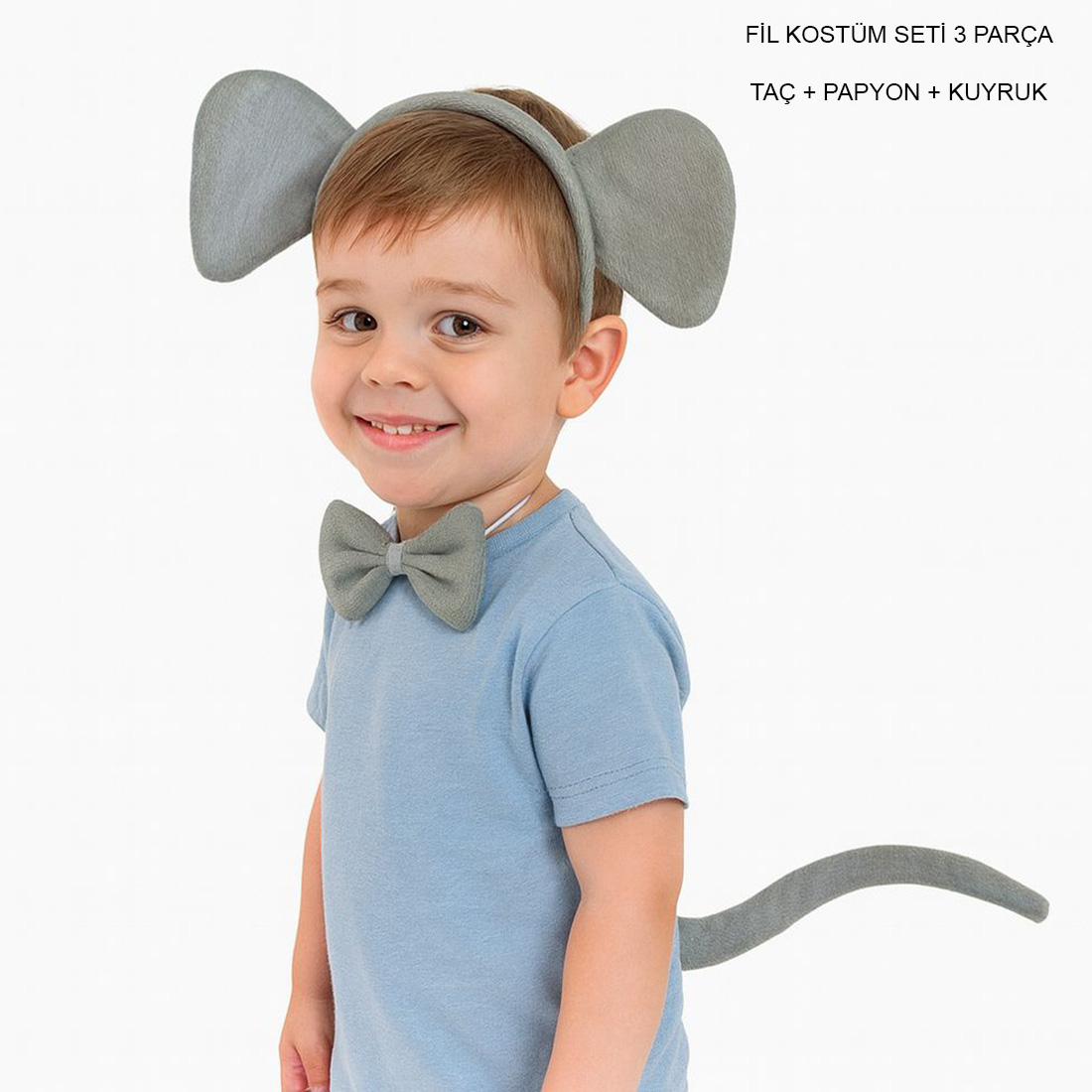 Fil Kostümü Aksesuar Seti 3 Lü Taç Papyon Kuyruk