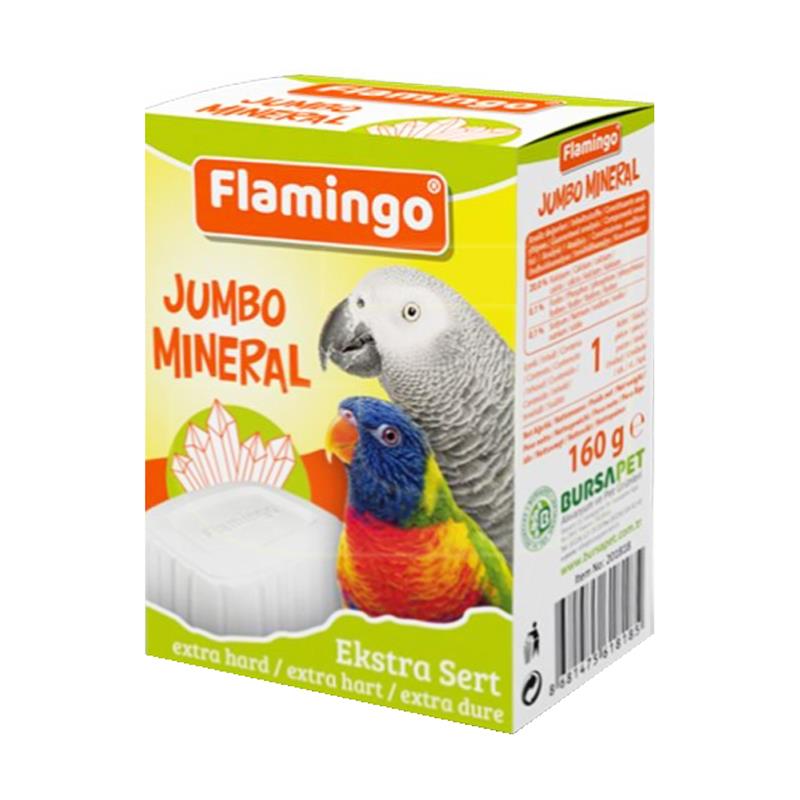 Flamingo Jumbo Mineral Büyük Kuşlar İçin Gaga Taşı 160g Flamingo Jumbo Mineral, sağlıklı kemik gelişimi için esansiyel olan mineral ve doğal iz elementleri içerir. Doğal kuvarz kum taşları ile sindirime yardımcı olur. Aynı zamanda kuşların uzayan gagalarını törpülemeye yarar. Ürünün arkasında bulunan teller sayesinde, her türlü kafes için uygundur.