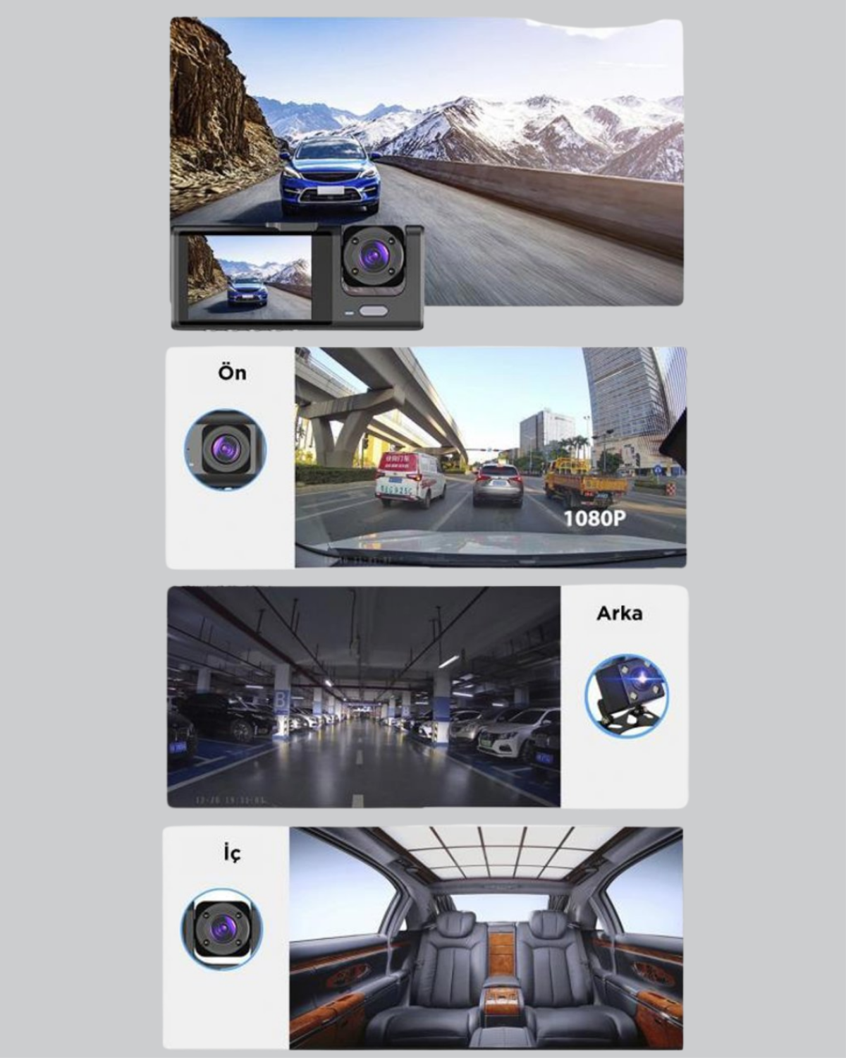 Araç içi güvenlik için tasarlanan bu kamera, üçlü kayıt özelliğiyle sürüş sırasında kapsamlı koruma sunar. Full HD ön kamera, HD arka ve iç kameralarla birleşerek yolun ve aracın tüm detaylarını kaydeder. Gece görüş özelliği, zifiri karanlıkta dahi net görüntüler sağlar. 170° geniş açılı lens, geniş görüş alanı sunarak sürüş güvenliğinizi artırır. G-sensör sistemi, ani darbeleri algılar ve kritik görüntüleri otomatik kilitler. Park halinde iken hareket algılama devreye girerek aracınızı 24 saat izler. 2 inç ekran, kolay kullanım sağlar ve kayıtları anında izleme imkânı sunar. 32 GB’a kadar Micro SD kart desteği uzun süreli kayıt sağlar. Suya ve toza dayanıklı gövdesiyle dayanıklılığı artırılmıştır. Kompakt tasarımı sayesinde aracınızda yer kaplamaz. Hem şehir içi kullanımda hem de uzun yolculuklarda güvenlik sağlayarak sürüşlerinizi çok daha güvenli hale getirir.