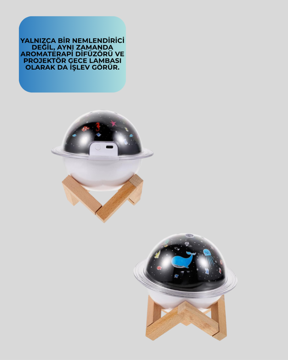 Bu çok fonksiyonlu hava nemlendirici cihazı, kullanıcıya hem sağlık hem de konfor sunar. Havayı nemlendirerek solunum yollarını rahatlatır, aynı zamanda projektör ışık fonksiyonuyla gece kullanımında huzurlu bir ortam yaratır. Cihaz, USB bağlantı noktası ile kolayca çalıştırılabilir. Şarjlı modellerle benzer şekilde, düşük enerji tüketimiyle verimli kullanım sağlar. Esansiyel yağ desteği sayesinde aroma difüzörü olarak da kullanılabilir. PP, PC ve silikon malzemelerle üretilmiştir; uzun ömürlü ve güvenlidir. Kompakt boyutu sayesinde çantanıza atıp kolayca taşıyabilirsiniz.