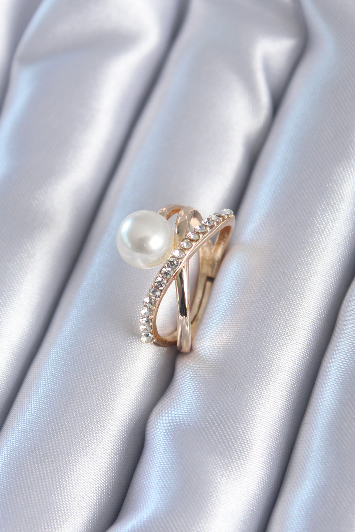 Gold Renk İncili Zirkon Taşlı Kadın Yüzük - TJ-BYK2806