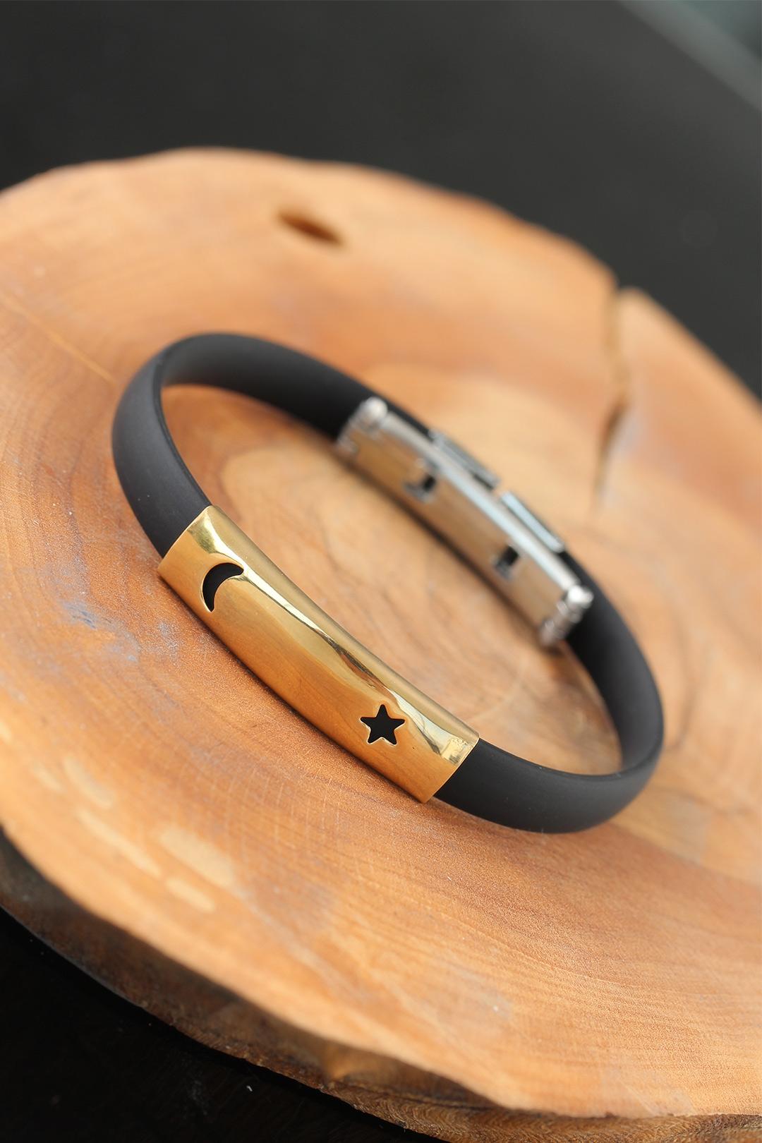 Gold Renk Metal Ay Yıldız Tasarım Siyah Renk Silikon Erkek Bileklik - TJ-EB2518-KS