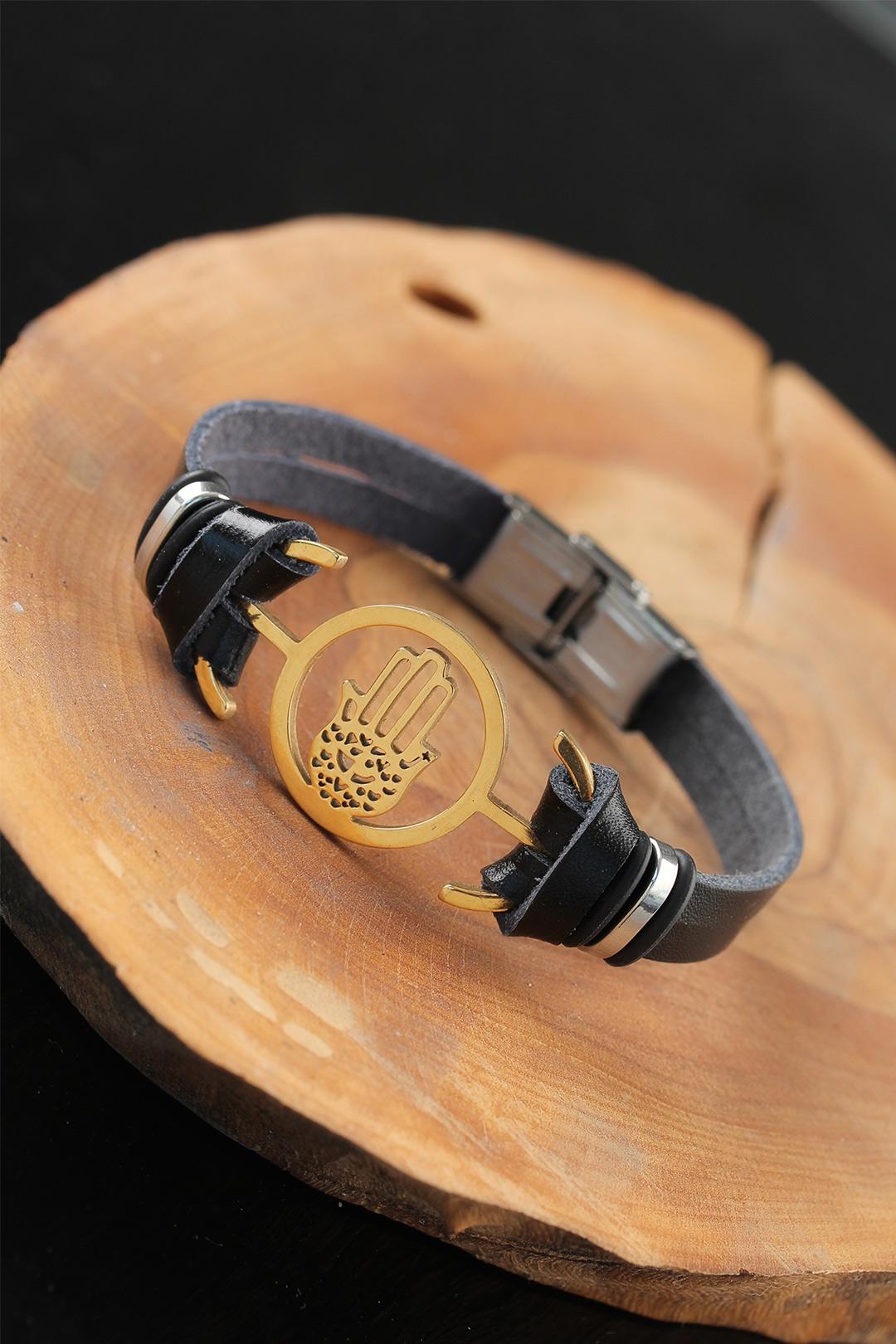 Gold Renk Metal Fatma Ana Eli Tasarım Siyah Renk Deri Erkek Bileklik - TJ-EB2558-KS