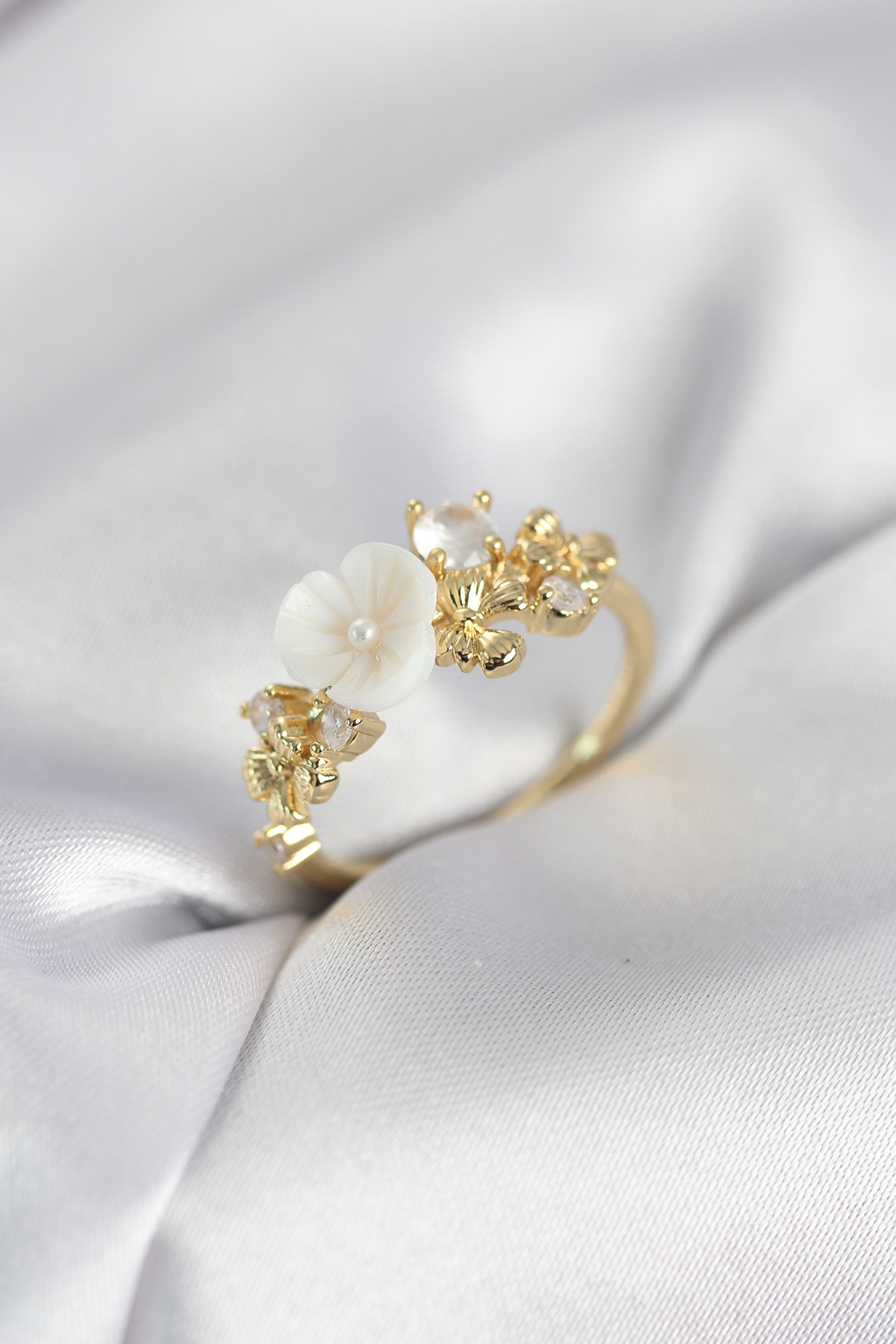 Gold Renk Pirinç Çiçek Model Zirkon Taşlı Kadın Yüzük - TJ-BYK4070