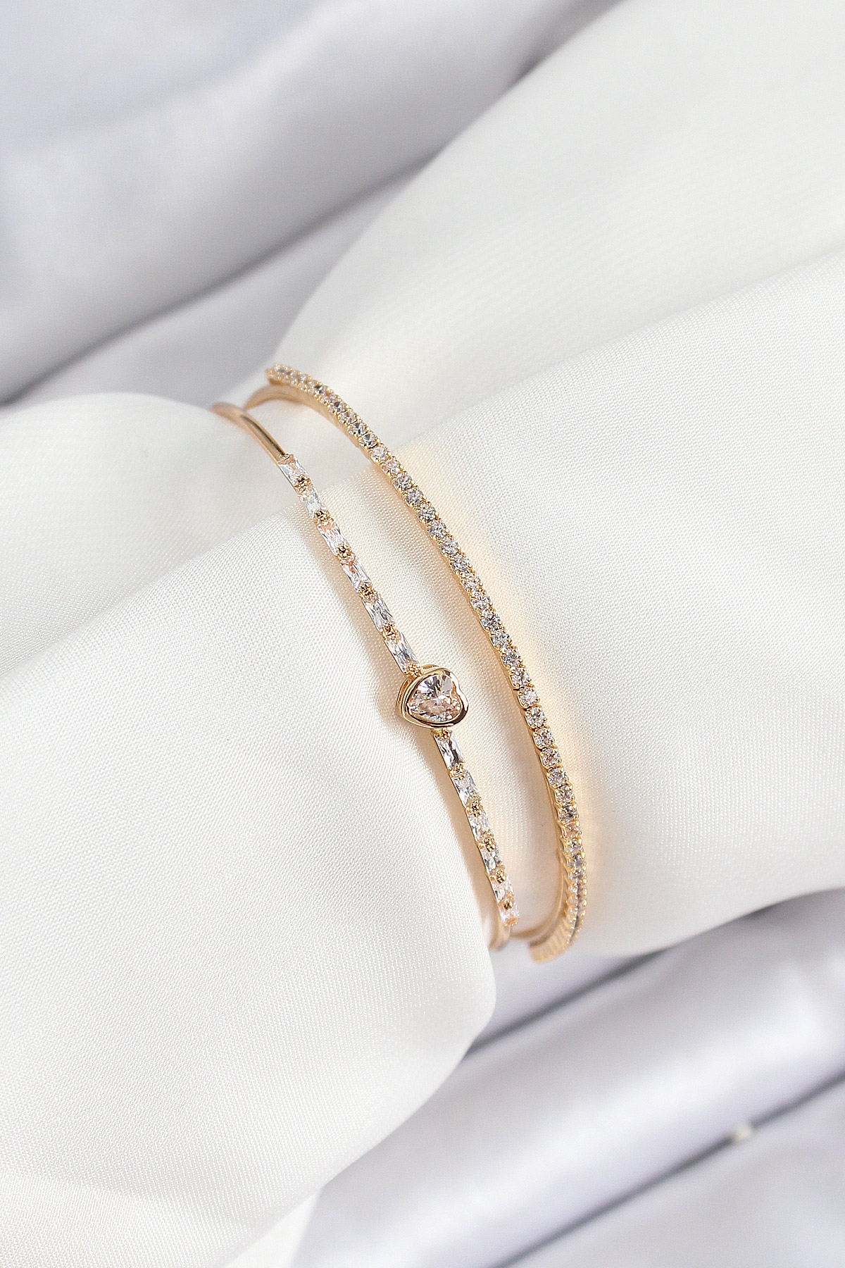 Gold Renk Pirinç Kalp Detaylı 2'li Kadın Bileklik - TJ-BB7058