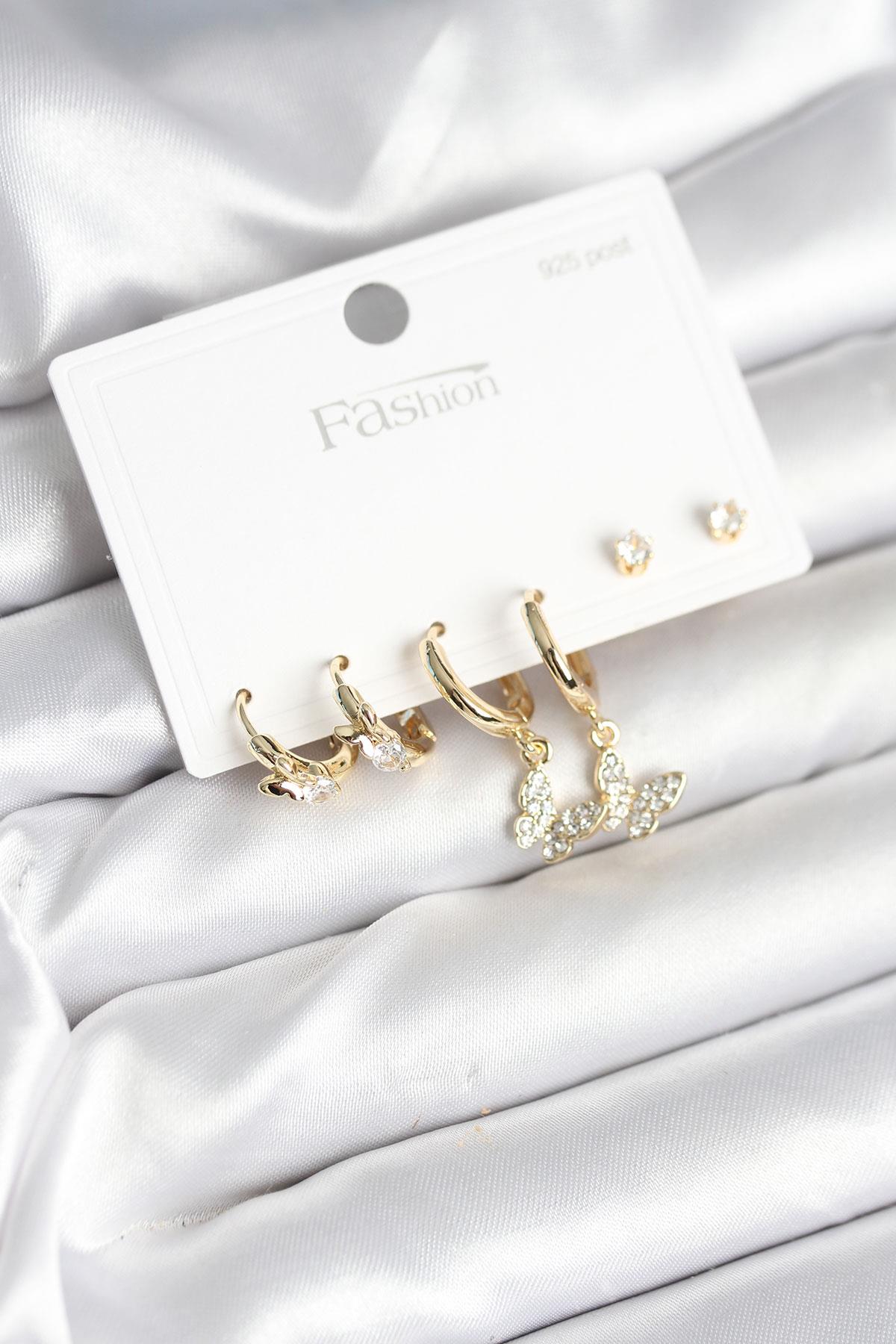 Gold Renk Pirinç Kelebek Model 925 Ayar Gümüş Çivili Kadın Küpe Seti - TJ-BKP11273