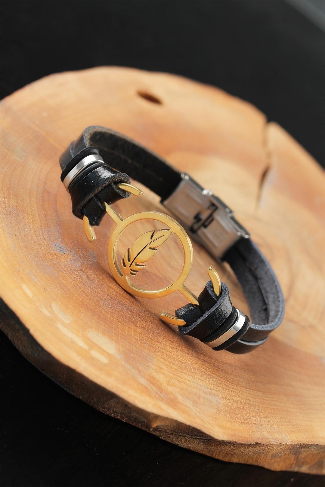 Gold Renk Yapraklı Metal Aksesuarlı Siyah Deri Erkek Bileklik - TJ-EB2547-KS