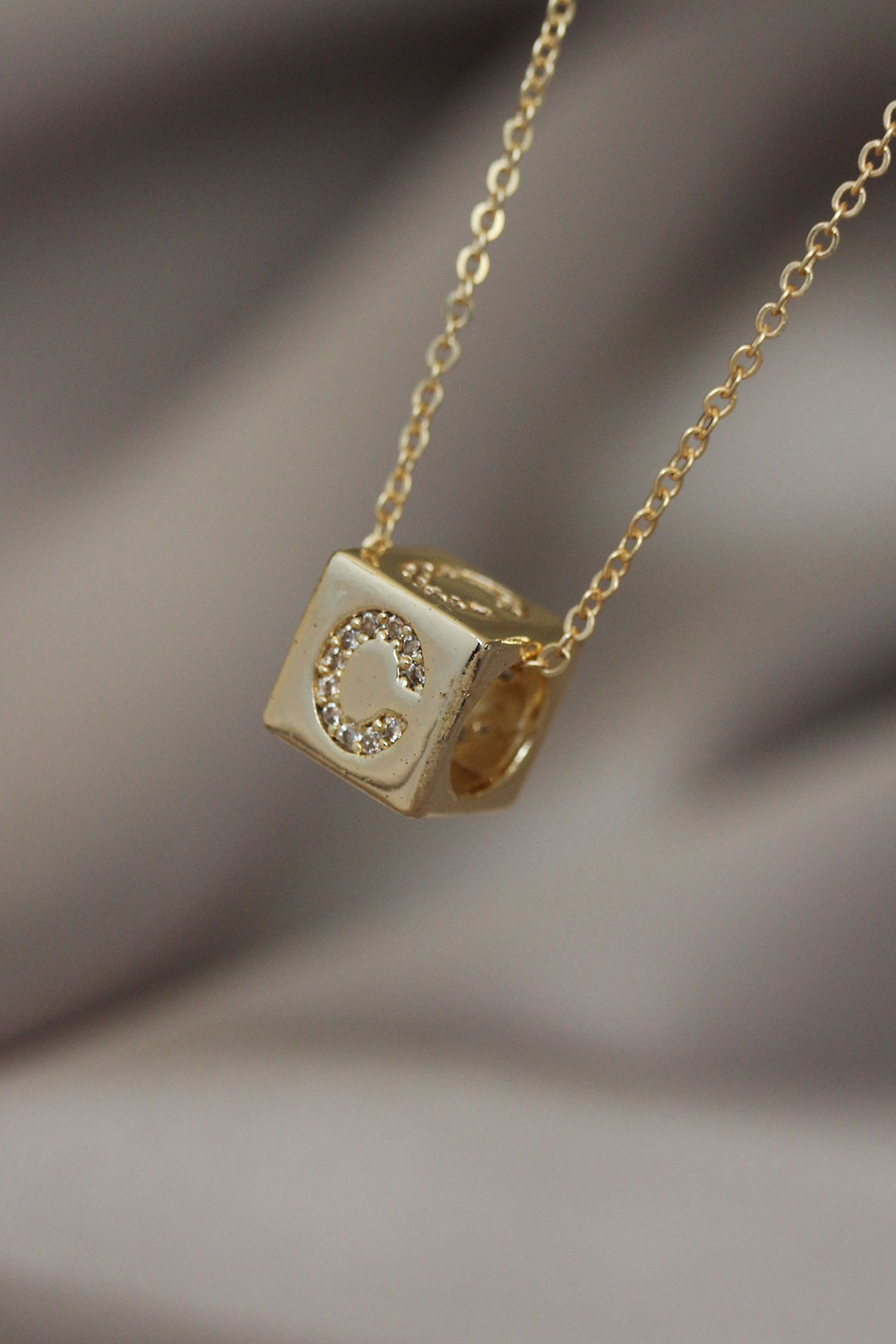 Gold Renk Zirkon Taşlı Küp Model C Harfli Kolye - TJ-BKO5199