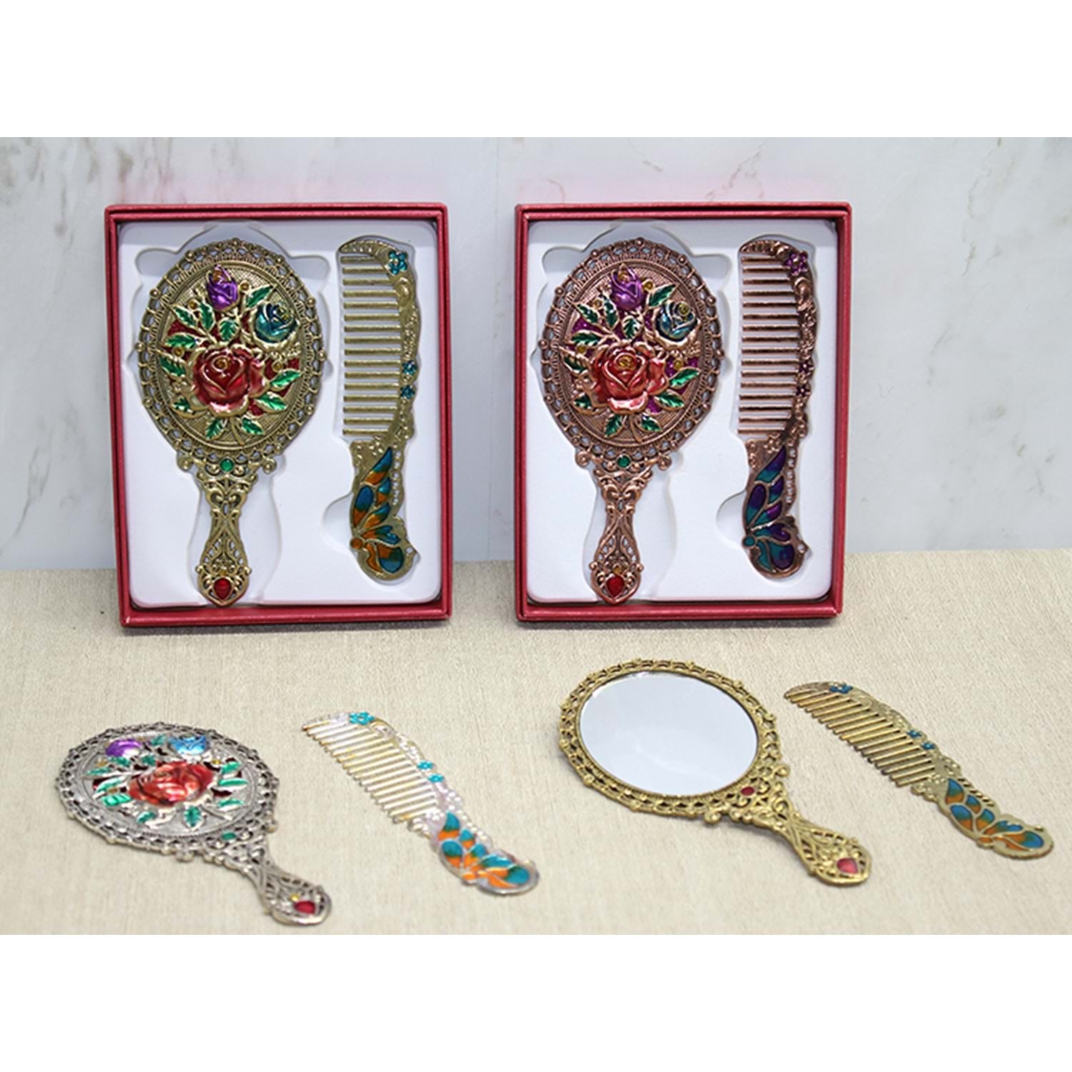 Gül Tasarımı Ayna Ve Tarak Seti Küçük Boy
