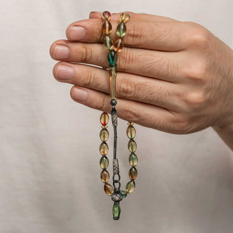 Gümüş 1000 Ayar Kazaz Püsküllü Sıkma Kehribar Tesbih