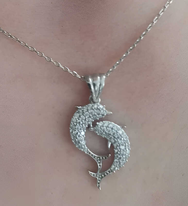 Yunuslar insanlara olan sevimlilikleri ile yegane dostlarımızdır. Bu sevimli dostlarımızı sizler için bu şık tasarım kolyeye yansıttık. Bu aşk dolu kolye modeli; doğum günü hediyesi, sevgililer günü hediyesi veya annelere hediye olarak özel günlerde tercih edilebilecek mükemmel bir seçenektir. Kolye; 925 ayar gümüşten imal edilmiştir. Gümüş üzerine rodyum kaplama yapılmıştır. Rodyum kaplama yapılan kolyeler parlaklığını uzun süre muhafaza eder ve oksitlenmesi gecikir. Diğer kolyelerde olduğu gibi gümüş çift yunus balığı kadın kolye de el emeği ile üretilmiştir. Gümüş ve değerli taşlar nedeniyle belirtilen ortalama ürün ağırlığında ± %10 sapma olabilmektedir.