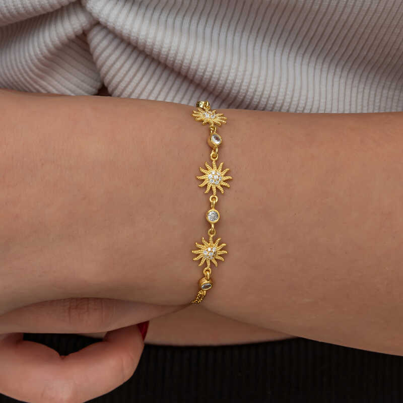 Güneş; ışığın, bilginin, iyiliğin, gücün ve yönetimin sembolüdür. Bu ışıl ışıl ve farklı tasarımıyla göz kamaştıran bileklik; 925 ayar gümüşten imal edilmiştir . Gümüş üzerine gold kaplama yapılmıştır.Gold kaplama yapılan gümüş ürünler parlaklığını uzun süre muhafaza eder, oksitlenmesi gecikir. Gümüş güneş bayan bilekliğin üzerinde bulunan taşlar zirkon'dur. Tüm gümüş bileklikler de olduğu gibi güneş bayan bileklik de tamamı el emeği ile üretilmiştir. Ürünlerimizin tamamı el emeği ile üretilmiştir. Gümüş ve değerli taşlar nedeniyle belirtilen ortalama ürün ağırlığında ± %10 sapma olabilmektedir.