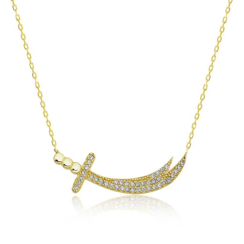 Tarihçilere göre Mısır Melik'i Mukavkas bu kılıcı Hz. Muhammed'e hediye etmiştir. Amrû bin Adûd, savaşta kendisine karşı çıkacak bir savaşçı istediğinde Peygamber, Ali'ye bu kılıcı uzatarak onun karşısına çıkmasına izin vermiştir. Hz. Ali'nin Uhud savaşında Kureyş’in önde gelen savaşçılarından dokuz kişiyi öldürdüğü, bu savaşta bedeninden yetmiş yara alarak son ana kadar Hz. Muhammed'i savunduğu, bu sebeple de Cebrail'in, “Zülfikar'dan keskin kılıç, Ali’den büyük yiğit yoktur.” "Lâ fetâ illâ Ali, lâ seyfe illâ Zülfikâr" dediği rivayet edilir. Ali'nin vasiyeti üzerine Necef'te denize atıldığı belirtilmiştir. Zülfikar kılıcı kadın kolye modeli 925 ayar gümüşten imal edilmiştir. Gümüş üzerine gold kaplama yapılmıştır. Gold kaplama yapılan gümüş kadın kolye modelleri parlaklığını uzun süre muhafaza eder. Ürünlerimizin tamamında olduğu gibi gümüş zülfikar kılıcı kadın kolye modeli de el emeği ile üretilmiştir. Gümüş ve değerli taşlar nedeniyle beliritlen ortalama ürün ağırlığında ± %10 sapma olabilmektedir.
