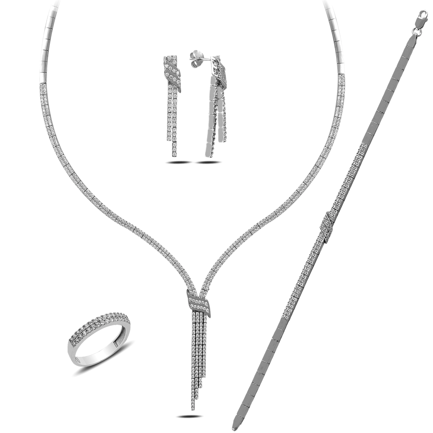 Modern çizgilerle klasik şıklığı buluşturan Gümüş Zirkon Taşlı Kemerli Su Yolu Kadın Set, zarafetiyle dikkat çeken özel bir tasarımdır. Su yolu formunda dizilmiş zirkon taşlar, kemerli detayla birleşerek sete güçlü ve sofistike bir karakter kazandırır. Işığı kusursuz şekilde yansıtan zirkon taşlar, her ortamda etkileyici bir parlaklık sunar. Kolye, küpe, bileklik ve yüzükten oluşan bu uyumlu set; davetlerde, özel günlerde ve şıklığını ön plana çıkarmak istediğin her an rahatlıkla tercih edilebilir. 925 ayar gümüşten üretilen set, kaliteli işçiliği ve zamansız tasarımı sayesinde uzun süreli kullanım sağlar. Hem klasik hem modern tarzlara kolayca uyum sağlayan bu özel tasarım, hediye seçeneği olarak da öne çıkar. Gümüş ve değerli taşlar nedeniyle belirtilen ortalama ürün ağırlığında ± %10 sapma olabilmektedir.