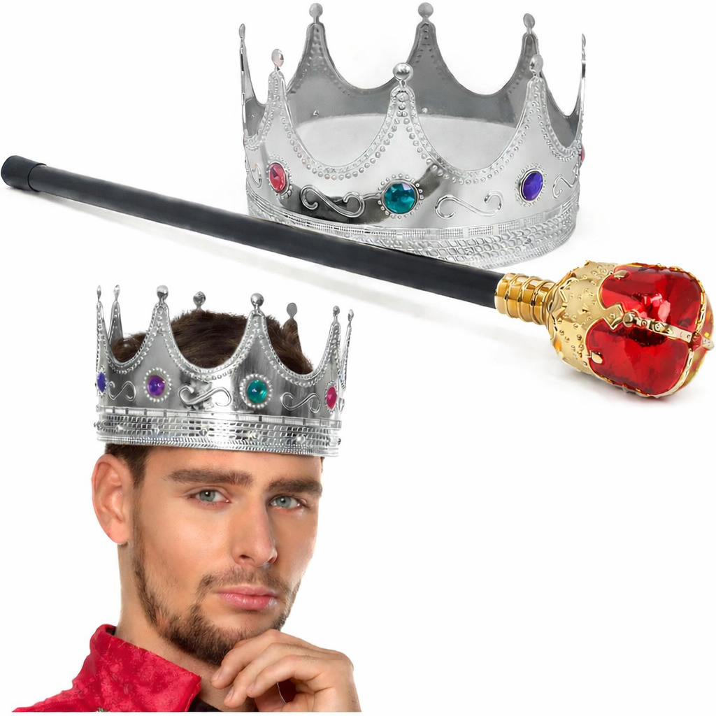 Gümüş renk taşlı kral tacı ve kırmızı gold topuzlu kral asası ile kraliyet şıklığını tamamlayın.