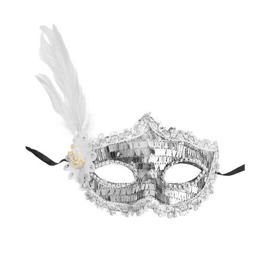 Gümüş payetli pullu beyaz renk yandan tüylü parti maskemiz: