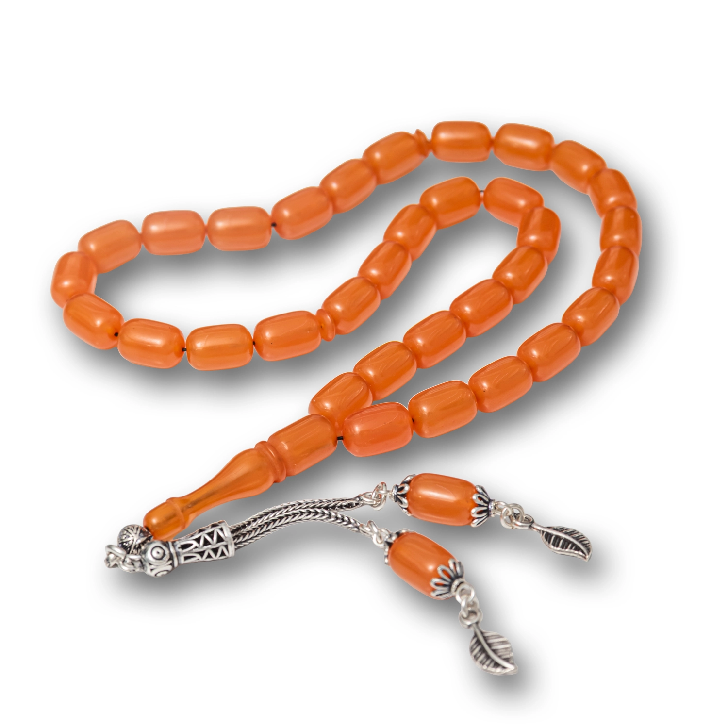 El işçiliğinin zarafetini taşıyan Gümüş Püsküllü Turuncu Kapsül Kesim Sıkma Kehribar Tesbih, göz alıcı turuncu rengi ve estetik kapsül kesimiyle hem koleksiyon severlerin hem de günlük kullanıcıların beğenisini toplar. Parlak yüzeyi ve dengeli dizilimi sayesinde akıcı ve rahat bir çekim sunarken, gümüş püskül detayları tesbihe asil ve otantik bir hava kazandırır.Ustalıkla işlenen her detay, geleneksel tesbih kültürünü modern çizgilerle buluşturur. Manevi değeri yüksek, gösterişli yapısıyla hem kendiniz hem sevdikleriniz için değerli ve anlamlı bir seçenektir. Gümüş ve değerli taşlar nedeniyle belirtilen ürün ağırlığında ± %10 sapma olabilmektedir.