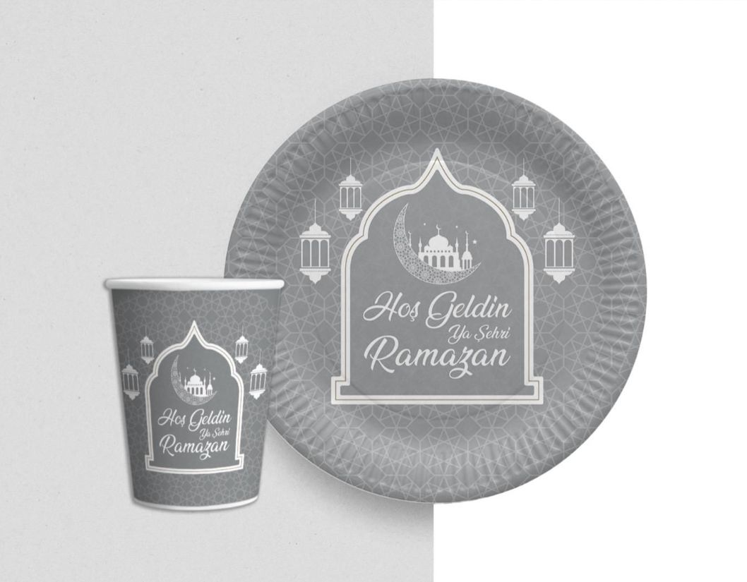 Gümüş Renk Hoşgeldin Ya Şehr-i Ramazan Yazılı Tabak ve Bardak Seti 16 Adet